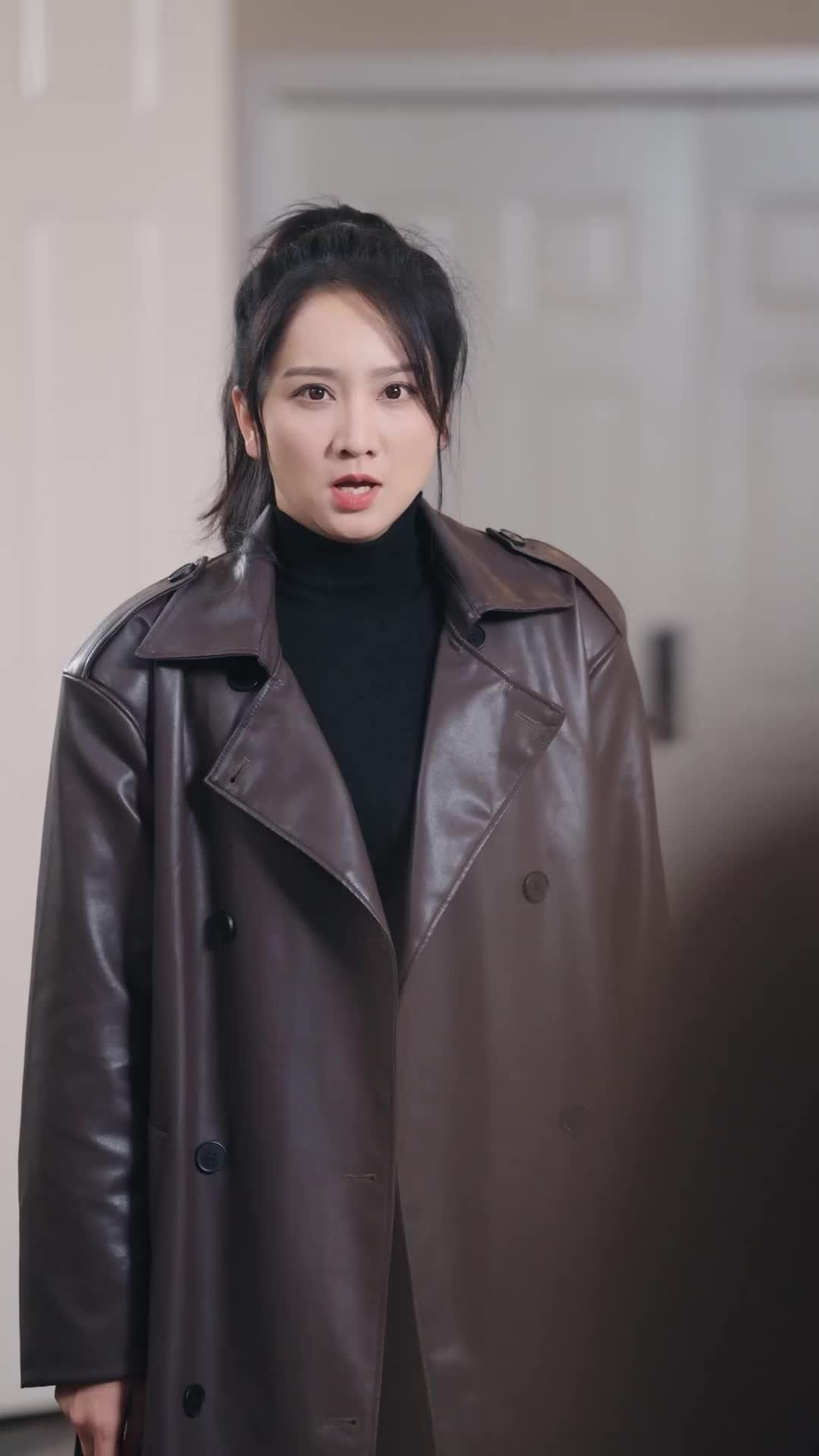 Let’s talk about that leather coat—deep brown, glossy, double-breasted with oversized lapels and black buttons that gleam like judgmental eyes. It’s not just clothing; it’s armor. And the woman wearing it? Lin Xiao, sharp-eyed, lips painted just enough red to signal she’s not here for tea. Her hair is pulled back in a messy bun, strands escaping like suppressed thoughts. She stands in what looks like a high-end villa hallway—cream walls, wooden doors, soft lighting that doesn’t forgive wrinkles or hesitation. Every frame of her shows tension coiled beneath stillness. She doesn’t blink much. When she does, it’s deliberate, like she’s recalibrating her next move. Her posture is upright but not rigid—she’s ready to pivot, to strike, to walk away. That coat flares slightly when she shifts weight, whispering movement before action. In one moment, she raises both fists—not aggressively, but with precision, as if rehearsed in front of a mirror. Not a fighter by trade, but someone who’s learned how to survive in rooms where words are weapons and silence is betrayal.