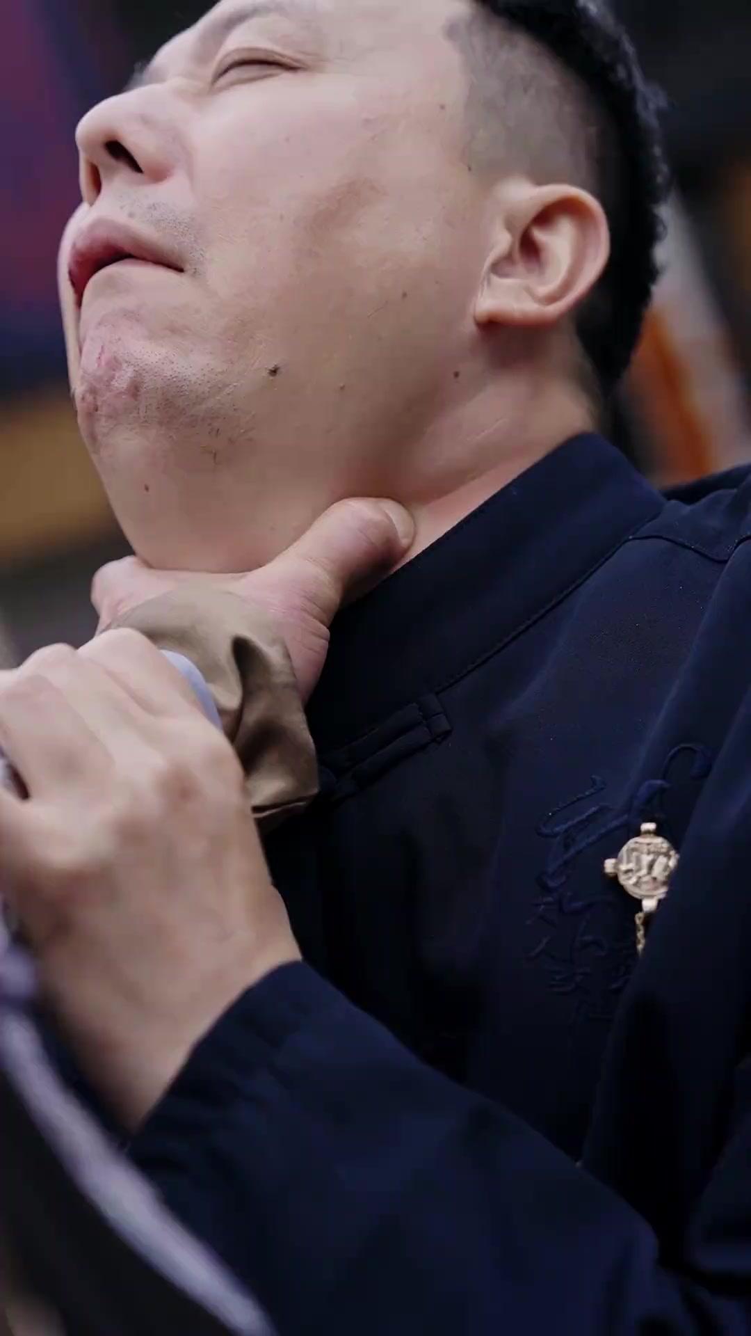 The violence begins subtly: a man in dark indigo robes—let’s call him Master Chen, though no one dares address him directly—is seized by the throat. His face contorts, eyes bulging, mouth open in a silent scream that finally breaks into a choked gasp. Blood trickles from the corner of his lips, staining the collar of his tunic. His attacker? An older man with a long white beard, dressed in a silvery brocade jacket left deliberately unfastened, revealing a bare chest marked by age and discipline. This is Elder Bai, the patriarch whose voice carries weight not because he shouts, but because he *chooses* when to speak. He does not strike; he *holds*. His grip is precise, clinical—like a surgeon applying pressure to a hemorrhaging artery. Yet there is no mercy in his eyes. Only calculation. Behind him, another elder—Master Feng, with the salt-and-pepper goatee and rust-red silk tunic—watches, hands clasped behind his back, brow furrowed not in concern, but in assessment. He knows this moment has been coming. He may have even helped engineer it.