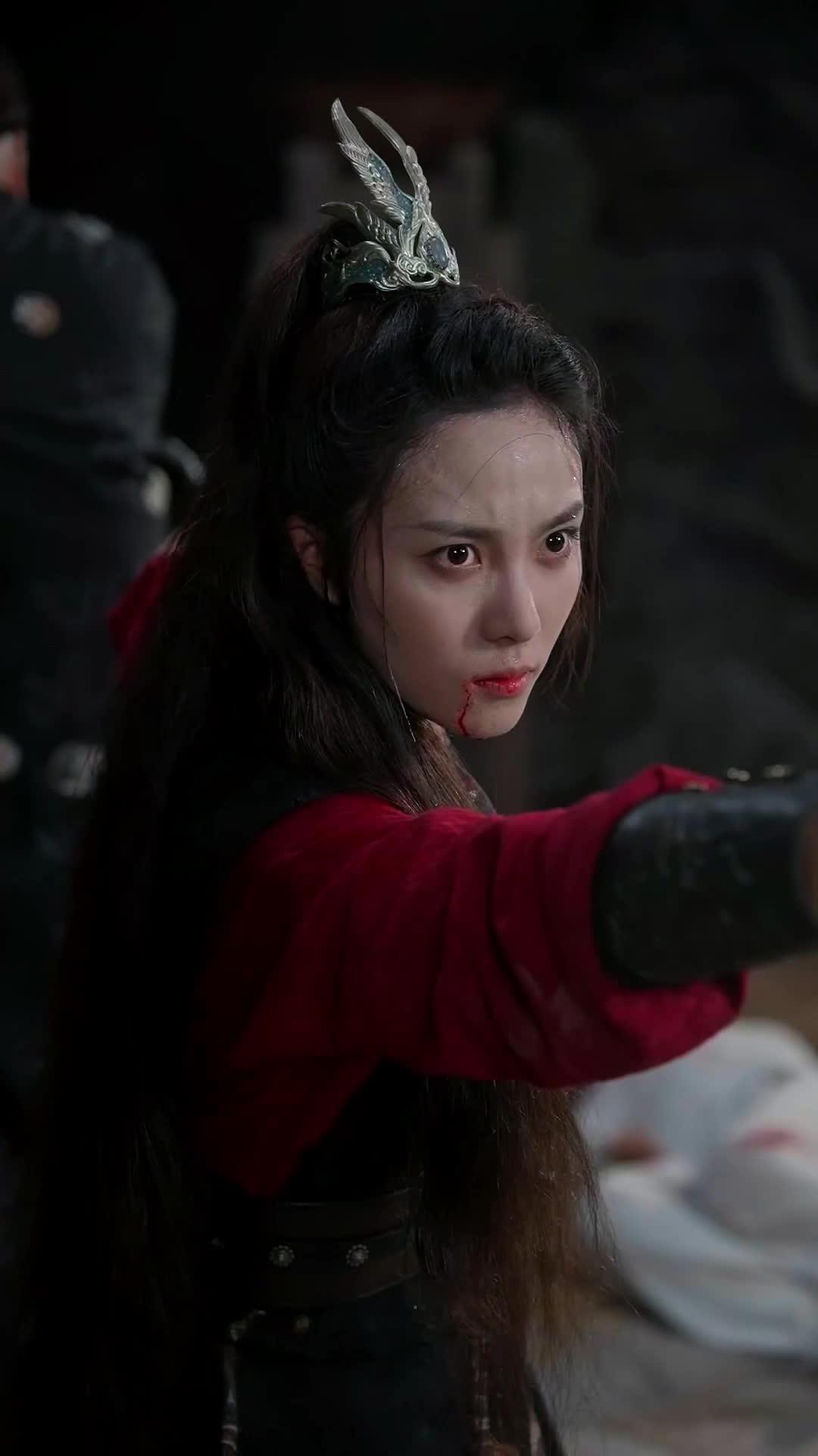 The scene opens not with a clash of steel, but with silence—thick, suffocating, and laced with the metallic tang of blood. Ling Xue, her crimson robes stark against the grey stone floor of what appears to be a forgotten shrine or cavernous temple, stands poised like a wounded phoenix. Her hair, long and dark as midnight ink, spills over one shoulder, partially obscuring the ornate silver phoenix crown perched defiantly atop her head—a symbol of sovereignty now tarnished by sweat and grime. A thin rivulet of blood traces a path from the corner of her mouth down her jawline, glistening under the single shaft of light piercing the gloom from above. Her eyes, wide and unblinking, lock onto an unseen adversary. There is no fear there—not yet. Only fury, sharpened by exhaustion, and the raw, animal instinct to survive. Her right arm is extended, fingers splayed, though no weapon is visible in that moment; it’s a gesture of command, of challenge, as if she’s still trying to will the world into obedience even as her body betrays her. This is not the collapse of a warrior—it’s the last gasp of a queen refusing to kneel.