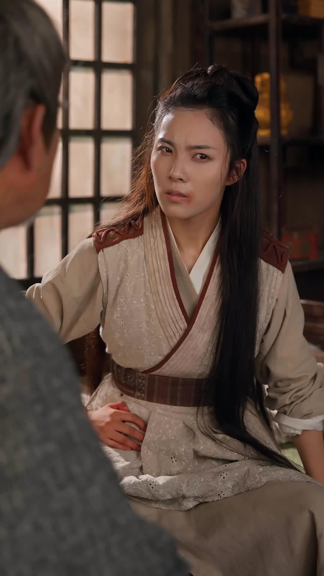 Cut to a sun-dappled herbalist’s chamber—wooden beams, shelves lined with lacquered drawers, the scent of dried chrysanthemum and bitter root hanging thick in the air. Here, the same woman, now stripped of regalia, wears a simple beige tunic with rust-brown trim, her long black hair half-bound, strands escaping like restless thoughts. A faint smudge of dirt mars her cheekbone. She sits cross-legged on a low platform, one hand pressed to her abdomen, eyes wide—not with fear, but with the raw, trembling urgency of someone who has just learned the world is built on lies. Across from her, Master Guan, an elder with silver-streaked hair tied high and a beard like frost on winter grass, leans forward, his grey robes worn soft at the cuffs. His hands move as he speaks—not gesturing for emphasis, but *shaping* the truth, as if words alone are too fragile to carry what he must say.