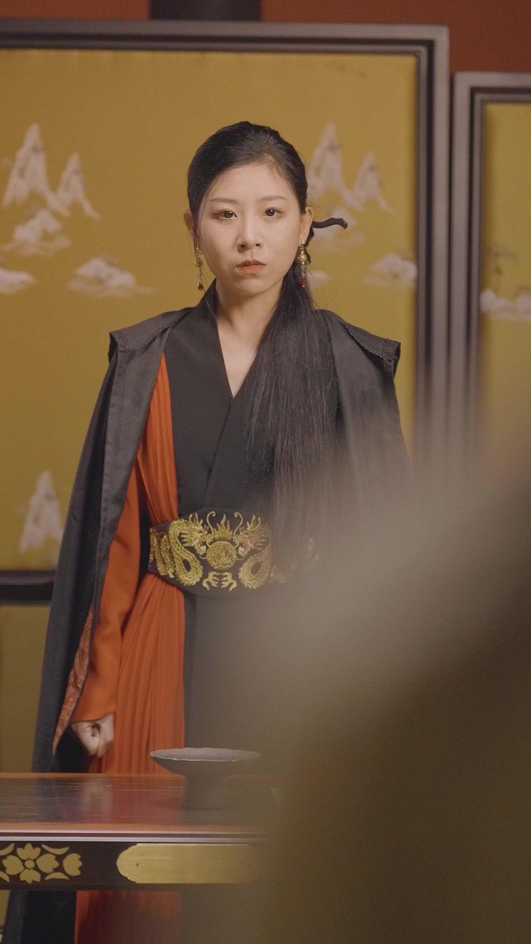 The first woman—let’s call her Lin Mei for now, though the show never names her outright in these frames—is dressed in a black robe with an embroidered golden dragon sash, orange undergarment peeking out like a warning flare. Her hair is pulled back with precision, a single ornamental pin holding it in place like a seal on ancient authority. She stands behind a lacquered table, hands resting at her sides, eyes fixed forward—not hostile, not welcoming, but *waiting*. There’s a stillness to her posture that feels less like calm and more like coiled tension, as if she’s already calculated every possible outcome before the first move is made. Behind her, yellow screens depict mist-shrouded mountains—classical Chinese landscape motifs that whisper of imperial courts, ancestral memory, and unspoken rules. This isn’t just décor; it’s worldbuilding via wallpaper.