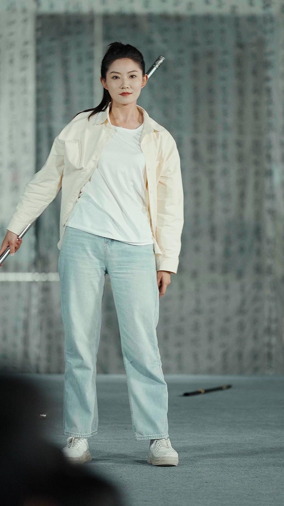 In a vast, dimly lit industrial hall—its exposed wooden trusses and translucent mesh curtains whispering of forgotten workshops—the air hums with anticipation. Not the kind that precedes a battle, but something quieter, heavier: the tension before a reckoning. At the center stands Lin Xiao, her posture relaxed yet unshakable, one hand resting lightly on the shaft of a gleaming spear. It’s not just any weapon; its ornate silver guard and etched blade suggest lineage, ceremony, perhaps even inheritance. She wears a cream-colored shirt over a white tee, faded jeans, and chunky white sneakers—casual armor in a world where formality is weaponized. Her hair is pulled back in a tight ponytail, practical, no-nonsense, yet her eyes hold a depth that belies her youth. This is not a performance for applause; it’s a declaration. And the audience? They’re not spectators—they’re participants in a ritual they didn’t know they’d signed up for.