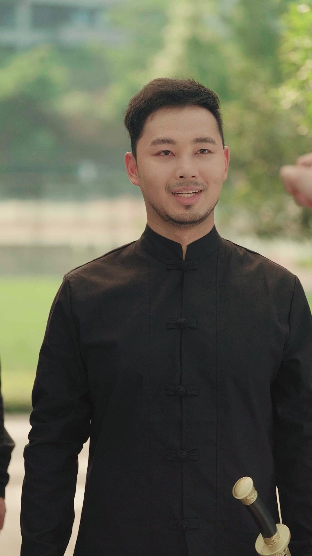 Let’s dissect the architecture of this confrontation. Four people stand in a loose semicircle on paved ground, trees framing them like sentinels, modern buildings looming like indifferent gods. Li Wei stands slightly forward, center frame, his black tangzhuang immaculate, his sword resting at his hip—not as a threat, but as a statement of identity. He doesn’t clutch it. He *wears* it, like a second skin. His posture is open, almost inviting, yet every muscle beneath that fabric is coiled. When he speaks, his voice is steady, unhurried, the kind of tone that makes you lean in, not because you’re curious, but because you’re afraid you’ll miss the word that changes everything. He says little, yet each phrase lands like a stone dropped into still water—ripples expanding outward, touching Chen Rui, Lin Xiao, even the man in white who arrives later, silent as snowfall.