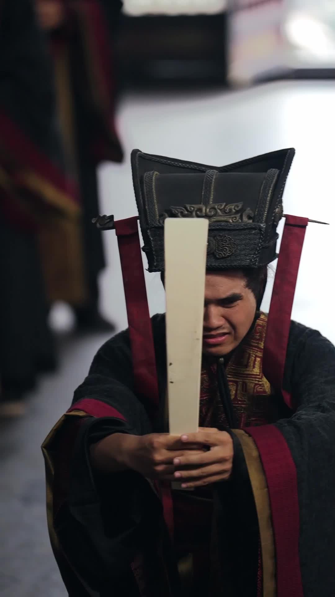 Enter Minister Zhao, a man whose presence alone shifts the room’s gravity. Clad in dark robes lined with vermilion and gold geometric patterns—a motif echoing ancient ritual bronzes—he advances with measured steps, the scroll held before him like a shield and a sword at once. His face is a landscape of controlled emotion: furrowed brows, lips pressed thin, eyes lowered—not in submission, but in calculation. Behind him, a line of officials stands frozen, their own tablets held upright, faces blurred by depth of field, yet their stillness screams complicity. This is not a court hearing; it’s a trial by atmosphere. Every footfall echoes off marble floors polished by centuries of deference. The open doors behind Zhao reveal a courtyard drenched in soft daylight, a stark contrast to the dim, incense-laden interior—a visual metaphor for truth versus concealment, outside world versus inner sanctum.