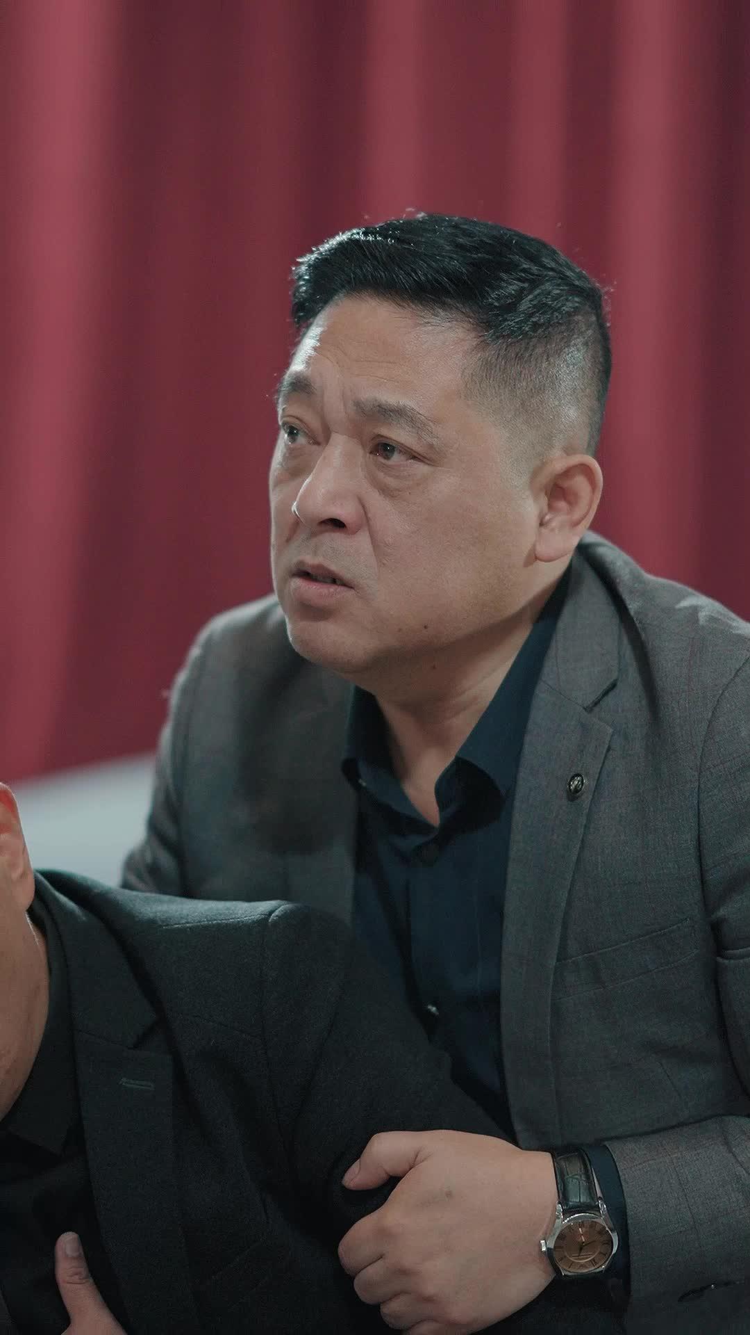 The opening shot lingers on a man in a charcoal-gray blazer—his expression caught mid-sentence, eyes wide, mouth slightly parted as if he’s just realized he’s said too much. His hand grips another man’s shoulder—not comfortingly, but possessively, almost like he’s preventing escape. That subtle physicality tells us everything: this isn’t a casual gathering. This is a confrontation disguised as ceremony. Behind him, the crimson drapes don’t just frame the scene—they *accuse*. Red here isn’t passion; it’s warning. It’s bloodline. It’s the color of inherited shame.