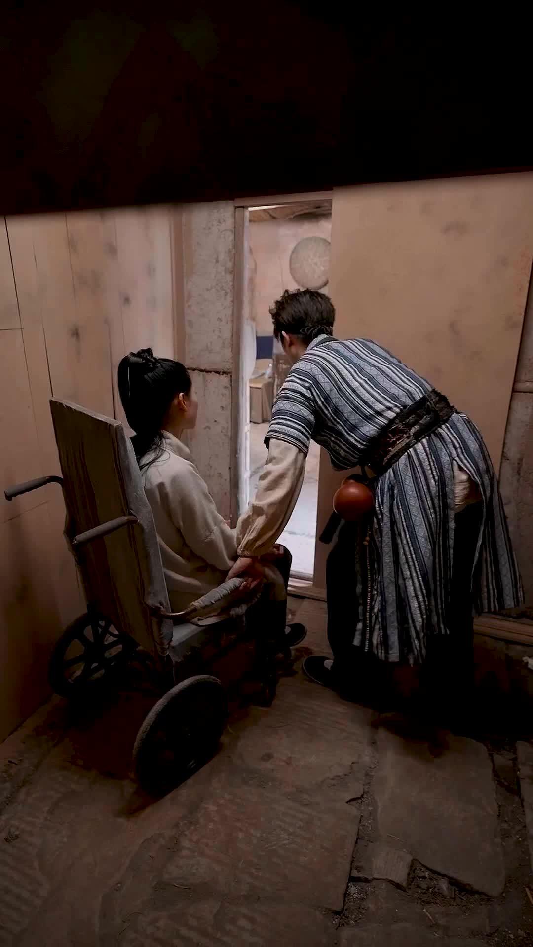 There’s a particular kind of dread that settles in your chest when you realize the person kneeling beside you isn’t trying to help—you’re the puzzle they’re trying to solve. That’s the atmosphere in the opening minutes of *Iron Fist, Blossoming Heart*, where Lin Mei sits immobilized in a wheelchair that feels less like aid and more like a cage disguised as comfort. The walls around her are unfinished plaster, stained with age and something darker—maybe smoke, maybe blood, maybe just time’s slow erosion. Kael, dressed in layered textiles that whisper of nomadic roots and forgotten kingdoms, moves with the precision of a surgeon preparing for incision. His hands hover near the door, not to open it, but to *listen* to it. To feel the vibrations of footsteps approaching from the other side. He knows they’re coming. He’s been waiting. And Lin Mei? She watches him, her expression unreadable—not because she’s numb, but because she’s calculating. Every blink is a decision. Every intake of breath is a rehearsal.