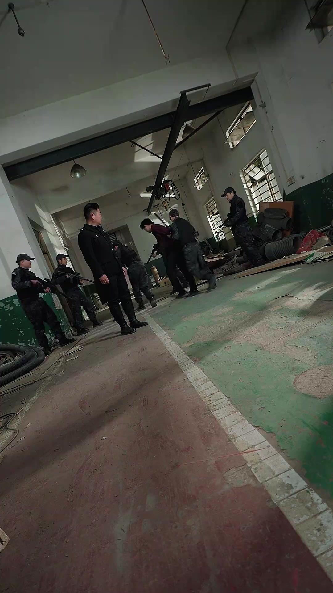 The scene opens not with a bang, but with silence—thick, dusty, and heavy. Sunlight slices through broken windows of an abandoned industrial hall, casting long, uneven shadows across peeling green paint and cracked concrete. A group of men in black uniforms stand like statues along the left corridor, their postures rigid, eyes fixed forward—not on the camera, but on something unseen beyond the frame. One man, slightly ahead, wears insignia that suggests authority, perhaps a security chief or former officer; his expression is unreadable, yet his jaw tightens as he glances toward the center aisle. This isn’t a raid. It’s a waiting game. And in that waiting, tension builds like steam in a sealed pipe.