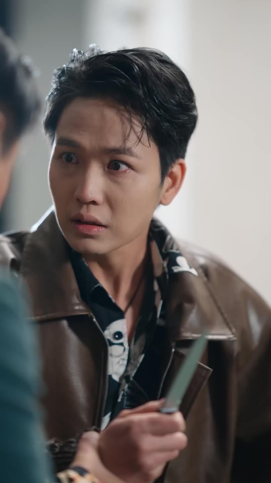 In the dim, peeling corridors of what looks like a derelict factory—or perhaps a forgotten gymnasium—the air hangs thick with dread, sweat, and something far more visceral: betrayal. This isn’t just a scene; it’s a psychological autopsy performed in real time, and every frame of *Joys, Sorrows and Reunions* feels like a confession whispered under duress. Let’s begin with Lin Jie—the young man in the brown leather jacket, his hair damp as if he’s been running from ghosts long before the camera rolled. His eyes, wide and trembling, don’t just register shock; they *absorb* it, like paper soaking up ink until the edges blur into panic. He holds a knife—not brandishing it, not threatening—just holding it, as though it were a relic he’d unearthed from his own past. The blade is small, almost domestic, yet its presence fractures the entire space. When he crouches beside the woman on the floor—her fur-trimmed coat splayed like a wounded animal’s pelt—his posture shifts from defensive to devotional. He doesn’t speak. He doesn’t need to. His fingers twitch toward her face, then stop, hovering inches away, as if afraid his touch might erase her entirely. That hesitation speaks louder than any monologue ever could.