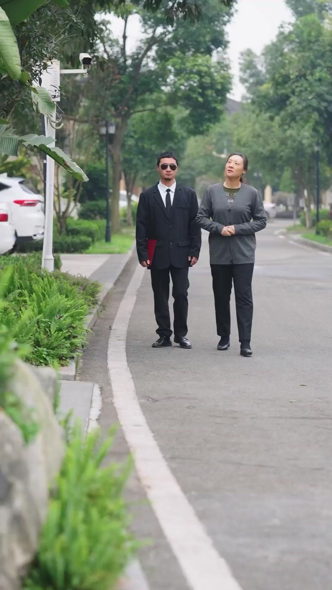 In the opening sequence of *Joys, Sorrows and Reunions*, we are introduced to a quiet suburban lane lined with lush greenery and elegant villas—a setting that whispers wealth, tradition, and restraint. Two figures walk side by side: a man in a sharp black suit, sunglasses masking his eyes, clutching a crimson envelope like a sacred relic; beside him, a woman in a grey cardigan over an olive-green blouse adorned with delicate beadwork—her expression shifting between anticipation and unease. This is not just a stroll—it’s a procession toward fate. The camera lingers on their synchronized steps, the pavement’s white line guiding them like a moral boundary they’re about to cross. Every detail—the parked white SUV, the security camera mounted high on a pole, the ornamental stone elephant flanking the entrance—suggests surveillance, legacy, and unspoken rules. When they arrive at the grand gate of the Li residence, the architecture speaks volumes: black lacquered doors with gold filigree, red tassels hanging like ceremonial warnings, and Chinese characters above the lintel reading ‘Qing Hua Yuan’—a name evoking purity and elegance, yet also irony, given what unfolds inside.