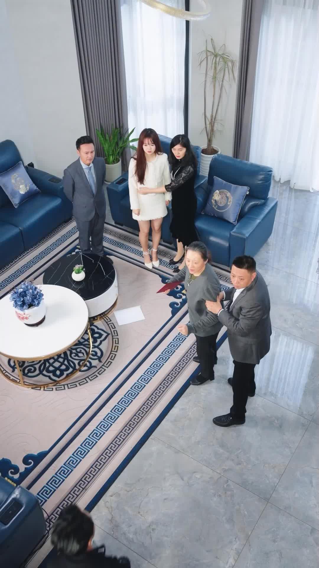 In the sleek, marble-floored lounge of what feels like a high-end real estate office—or perhaps a private law firm—the air hums with unspoken tension. Five figures stand arranged like chess pieces on a board that’s already tilted: two women, three men, and one silver briefcase lying ominously near the rug’s edge. The camera descends from above, as if God himself is leaning in, curious but unwilling to intervene. This isn’t just a meeting—it’s a reckoning. And at its center stands Lin Wei, dressed not in corporate gray but in black velvet, his lapel pinned with a brooch that looks less like jewelry and more like a weapon sheathed in elegance. His posture is rigid, yet his eyes flicker—just slightly—when the older woman, Aunt Mei, steps forward holding a crimson folder stamped with official seals. That folder, we soon learn, contains property deeds. But it also holds years of silence, resentment, and a truth no one dared speak aloud.