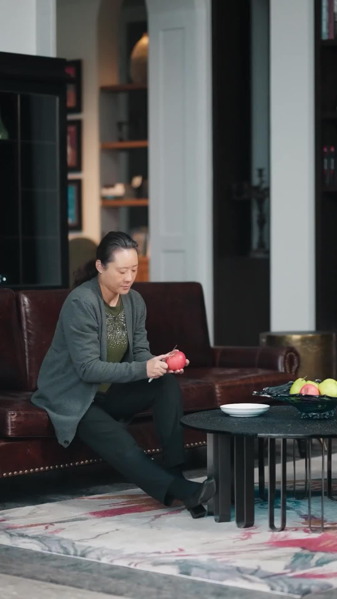 The first ten seconds of *Joys, Sorrows and Reunions* establish a grammar of silence. Li Mei, seated on the edge of a brown leather sofa, peels an apple with surgical precision. Her movements are unhurried, almost meditative—but her eyes dart toward the hallway, anticipating arrival. The setting is upscale but impersonal: dark wood shelves, abstract art, a rug with bleeding crimson streaks that feel less decorative and more like dried blood. This isn’t a home; it’s a stage set for emotional reckoning. When Zhang Wei enters, he doesn’t announce himself. He simply appears, holding a wooden box that gleams under the overhead light like a relic. His attire—black vest, patterned tie, crisp shirt—is formal, but his posture is deferential. He bows slightly as he presents the box, not as a gesture of respect, but as an act of surrender. Li Mei takes it without speaking. Her fingers brush the grain, and for a fleeting moment, her expression softens—not with joy, but with recognition. She knows this box. It belonged to her mother. It was sealed the night her brother vanished. And now, decades later, it’s back.