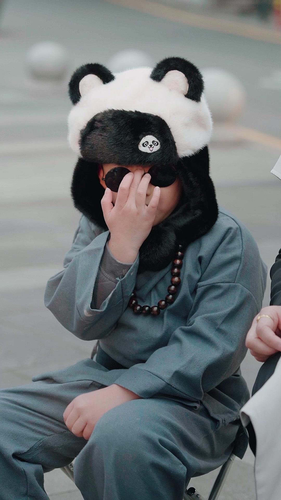 In a quiet urban plaza, where concrete meets greenery and the hum of city life fades into background murmur, a scene unfolds that feels less like street performance and more like a ritual—part theater, part social experiment, all steeped in layered irony. At its center stands Kong Fu Leo, a child no older than eight, draped in a grey robe reminiscent of ancient monastic garb, his head crowned with a plush panda hat complete with embroidered eyes and fuzzy ears. The hat isn’t just costume—it’s armor, identity, and punchline rolled into one. Around his neck hangs a string of dark wooden prayer beads, worn smooth by time or pretense; his round sunglasses, oversized for his face, lend him an air of detached coolness, as if he’s seen too much for his years. He sits on a folding chair, legs crossed, hands folded—or sometimes raised in dramatic gesture—as though channeling some forgotten sage. But this is no temple. This is pavement. And the audience? A mix of curious passersby, skeptical teens, and two elderly figures who seem to have stepped out of a different era entirely.