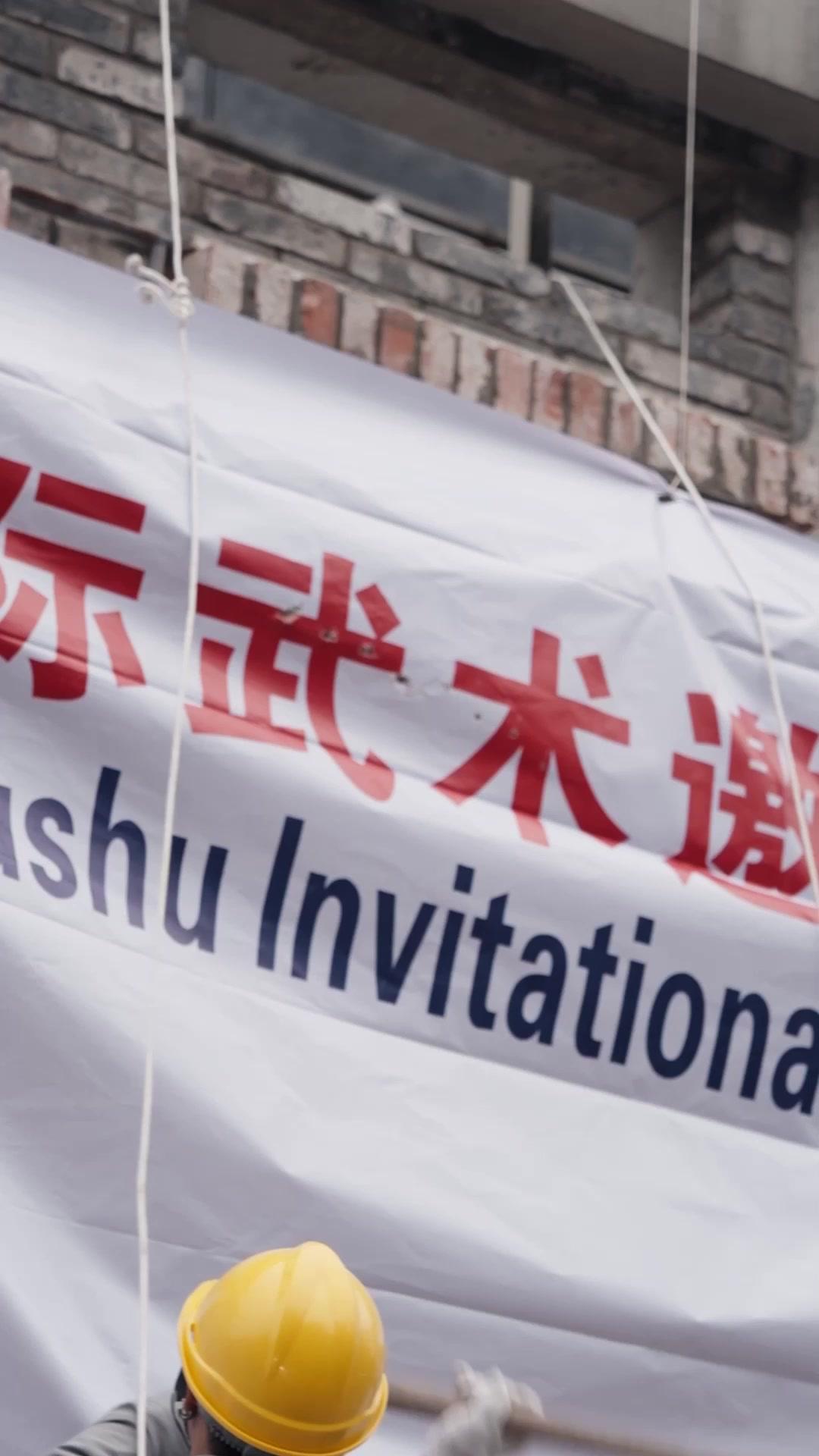 The opening frames of Kungfu Sisters don’t just show workers hoisting a banner—they stage a quiet rupture in the fabric of daily life. Two men in yellow hard hats, gray uniforms, and white gloves stand on scaffolding like figures from a forgotten industrial mural. Their movements are precise, almost ritualistic: one grips a long pole to smooth the canvas, the other dips a brush into a bucket—yes, a bucket—of what looks like diluted glue or paste, dabbing it onto the back of the banner as if sealing a pact. The banner itself reads ‘International Wushu Invitational Competition’ in bold red Chinese characters, with English beneath, but its real power lies not in the text—it’s in the tension between the mundane labor and the grandiose promise. Behind them, the brick wall is weathered, cracked, uneven; above, exposed rebar and unfinished concrete suggest a city still stitching itself together. This isn’t a polished venue—it’s a work-in-progress, a liminal space where ambition hangs by ropes and pulleys.