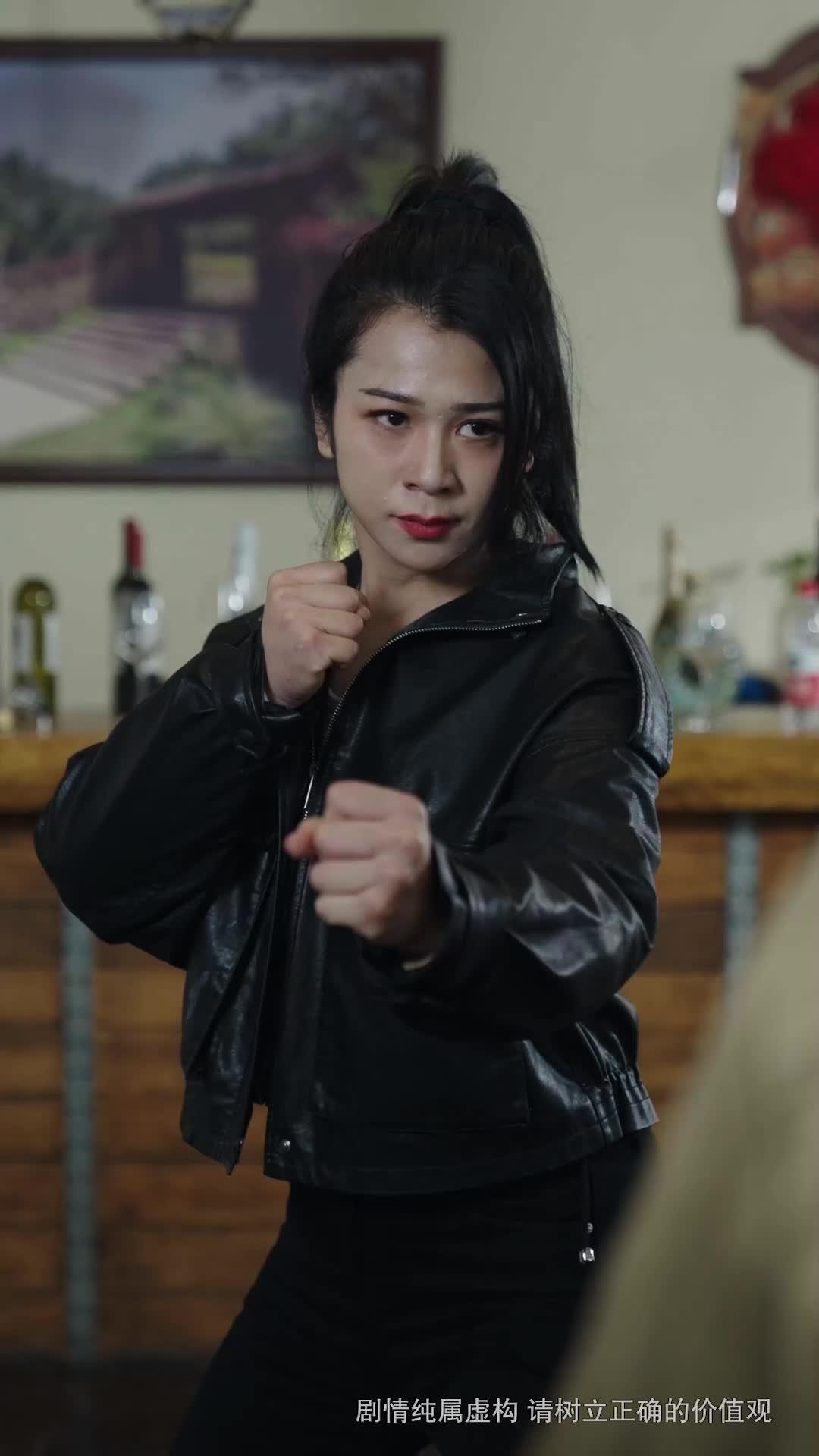 Let’s talk about the kind of scene that doesn’t just happen—it *unfolds*, like a blade sliding out of its sheath in slow motion. In this tightly edited sequence from *Kungfu Sisters*, we’re dropped into a rustic bar with wooden beams, stone fireplaces, and wine bottles lined up like silent witnesses. The atmosphere is thick—not with smoke, but with tension. And it all starts with one woman: Lin Xiao, her black leather jacket slightly scuffed, hair pulled back in a high ponytail that’s already starting to loosen at the edges, as if even her hairstyle knows something’s about to break.