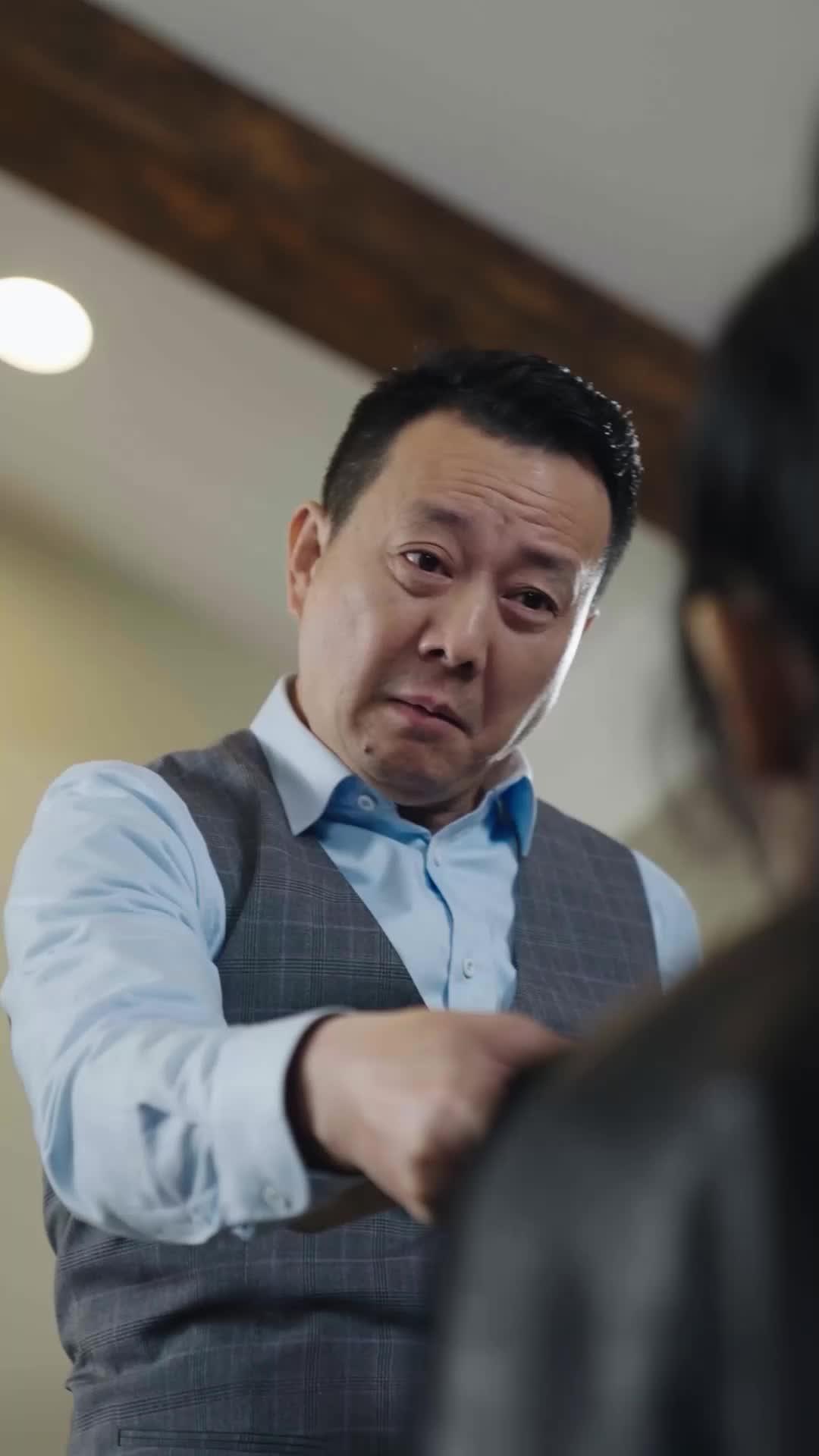Before this, we’re trapped in a brutal cycle: the kneeling woman, blood trickling from her split lip, eyes wide with exhaustion and defiance; two men gripping her shoulders like she’s cargo; the man in the vest—let’s call him Mr. Lin—raising a wooden rod not with rage, but with practiced cruelty. His expressions flicker between theatrical outrage and something far more unsettling: boredom. He doesn’t even look at her when he speaks. He looks *past* her, addressing the others, as if she’s already erased from the room. Meanwhile, the man in the beige double-breasted suit—Mr. Chen—stands off to the side, adjusting his tie, smiling faintly, almost amused. His laughter isn’t loud, but it cuts deeper than any shout. It’s the sound of someone who knows the rules of the game and enjoys watching others lose.