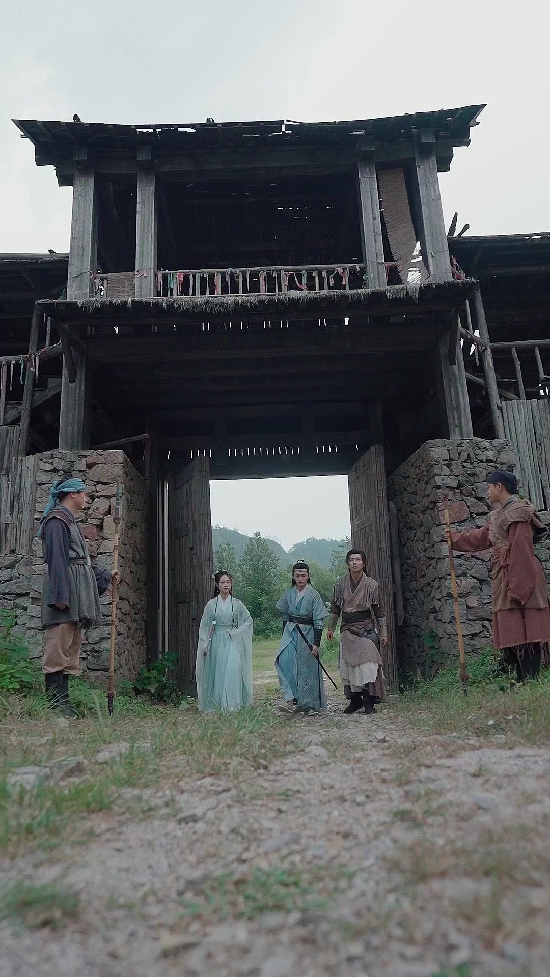 Let’s rewind. The trio enters the compound—not as invaders, but as guests who’ve been invited by a ghost. The gatehouse looms above them, its upper balcony draped in tattered cloth, laundry lines strung like forgotten treaties. Two guards flank the entrance, staffs planted firmly, eyes scanning the newcomers with the detached interest of men who’ve seen too many hopeful faces turn hollow. Yue Qing walks slightly ahead, her posture upright but not rigid—like a willow that bends without breaking. Her hair is braided with silver threads, each strand catching light like a coded message. She doesn’t look at the guards. She looks *through* them, toward the main hall, where red banners hang like wounds stitched shut with gold thread.