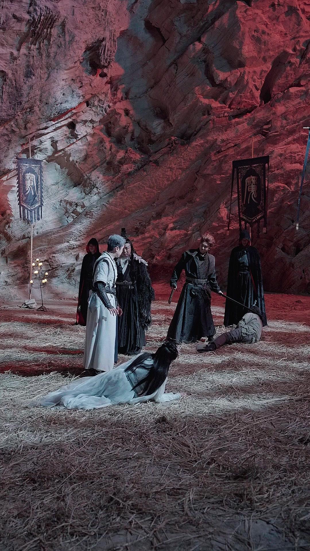 There’s a moment—just after the third cut, when the camera tilts upward from the straw floor—that the cave itself seems to exhale. Not metaphorically. Literally. Dust motes hang suspended in the red-tinged air, caught between the flicker of distant lanterns and the cold blue wash spilling from the entrance. That’s when you realize: this isn’t just a setting. It’s a character. The cavern in *Crimson Oath* doesn’t host the drama—it *feeds* on it. Every crack in the limestone walls echoes with past screams. Every stalactite drips condensation that tastes like regret. And in the center of it all, five figures orbit each other like wounded planets, drawn together by gravity they can’t name. Let’s start with the doll. Yes, *the* doll—the red fabric, the yellow cap, the white floral patterns stitched with thread that’s frayed at the edges. It’s absurdly small in her hands, yet it dominates the frame. Why? Because it’s the only thing in that space that hasn’t been weaponized. Li Feng has his sword. Lord Yan has his rings and his rhetoric. Chen Wei has his silence and his scars. But the doll? It’s soft. Vulnerable. Unarmed. And yet—it’s the most dangerous object in the room. Because it forces everyone to remember what they’ve buried beneath layers of armor and ideology. The blue-haired woman—her name is Mei Lin, though no one says it aloud until minute 47—doesn’t speak much. She doesn’t need to. Her eyes do the talking: wide, bloodshot, darting between Li Feng’s blade and Chen Wei’s kneeling form like a trapped bird calculating escape routes. Her fingers dig into the doll’s fabric, not to comfort herself, but to *anchor* herself. As if letting go would mean surrendering the last thread of who she was before the world burned.