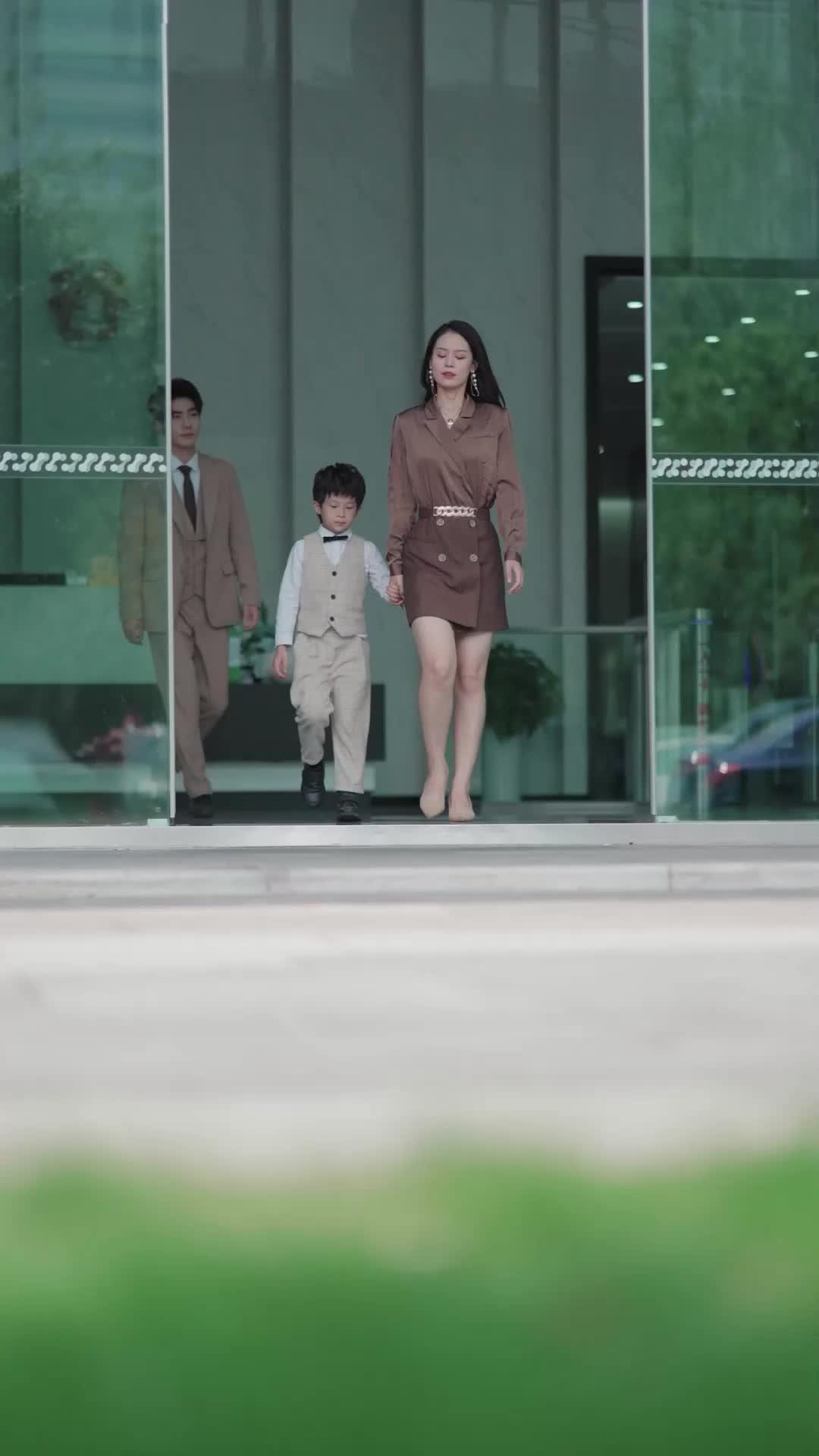 In the opening sequence of *Love, Lies, and a Little One*, we are introduced to a trio stepping out of a sleek glass building—Li Wei, his wife Lin Xiao, and their son, Kai. The composition is cinematic: low-angle framing, shallow depth of field, green grass blurred in the foreground, suggesting both privilege and emotional distance. Li Wei wears a beige three-piece suit with a paisley tie—elegant but slightly stiff, like a man rehearsing his role. Lin Xiao, in a tailored brown silk dress cinched with a gold-chain belt, holds Kai’s hand with practiced grace. Yet her eyes betray something else: hesitation, calculation, or perhaps exhaustion. Kai, no older than six, wears a cream plaid vest and bowtie, his expression solemn beyond his years. He doesn’t skip or glance at passing cars; he walks like someone who’s already learned to read silences.
