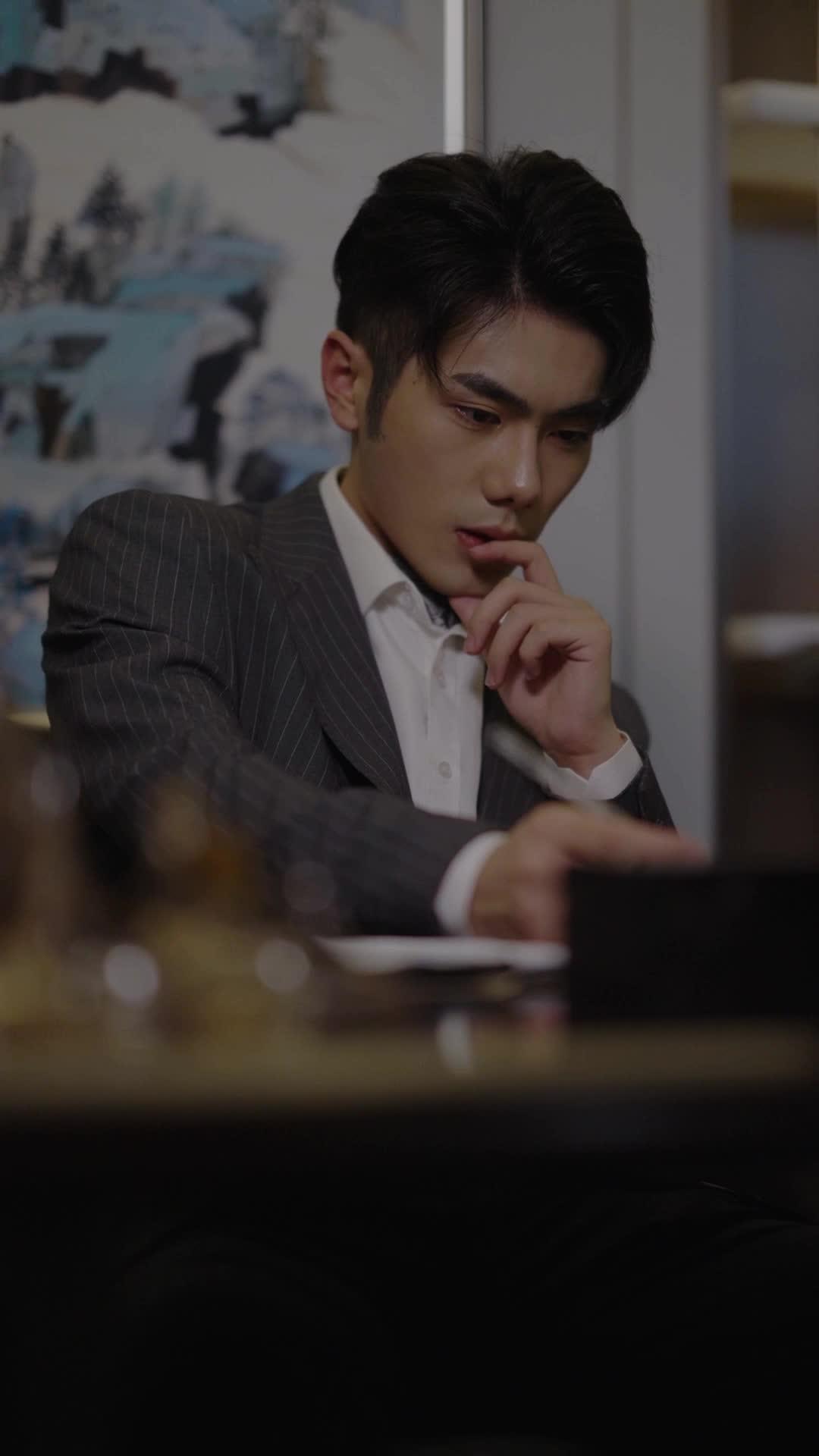 Cut to the office: same man, now in a pinstripe suit, pen hovering over paper, fingers pressed to his lips as if trying to silence his own conscience. The lighting is cool, clinical—no warmth, only precision. He writes something. We don’t see the words, but the way his hand trembles for a fraction of a second tells us it’s not a memo. It’s a confession. Or a lie. Or both. The background reveals curated art, glass shelves holding trophies that gleam like silent judges. This is a man who has built a life on appearances—and yet, every gesture betrays the cracks beneath. When he picks up his phone, the shift is subtle but seismic: his posture softens, his voice drops into a register reserved for secrets. He speaks quietly, almost tenderly, though his eyes remain sharp, calculating. Is he lying to the person on the other end? Or is he lying to himself, using the call as a rehearsal?