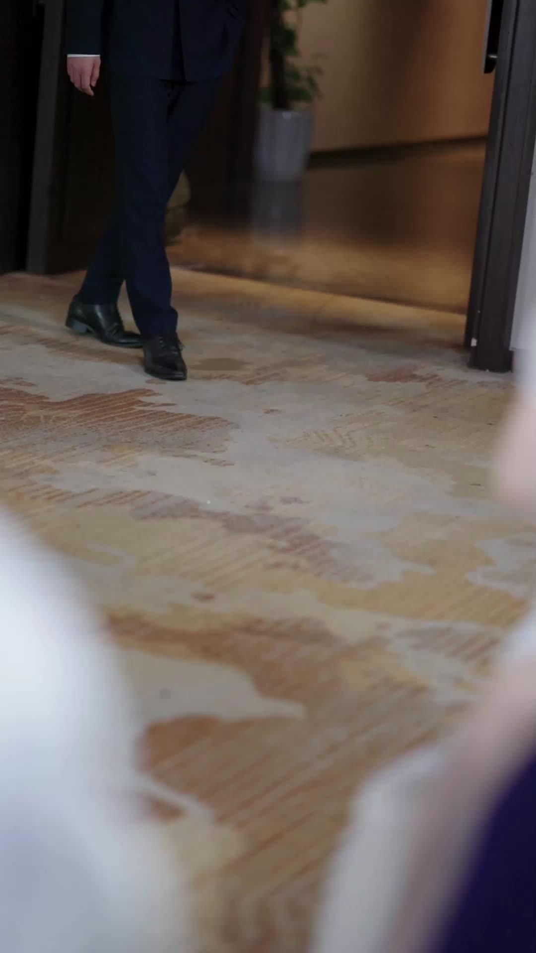 In the opening frames of *Love, Lies, and a Little One*, the camera lingers not on faces, but on feet—polished black oxfords stepping with deliberate precision across a marbled corridor. This is no casual entrance; it’s a declaration. The man in the navy double-breasted suit—let’s call him Lin Jian—moves like someone who knows he’s being watched, and more importantly, knows *who* is watching. His posture is rigid, his gaze fixed ahead, yet there’s a subtle hesitation in his stride, as if the floor itself resists his advance. Behind him, the blurred silhouette of a potted plant and warm ambient lighting suggest an upscale venue—perhaps a gala, a corporate summit, or the kind of high-stakes social gathering where reputations are built and shattered in under ten minutes. The low-angle shot forces us to look up at him, granting him authority—but also isolating him. He’s alone, even as others begin to enter the frame.