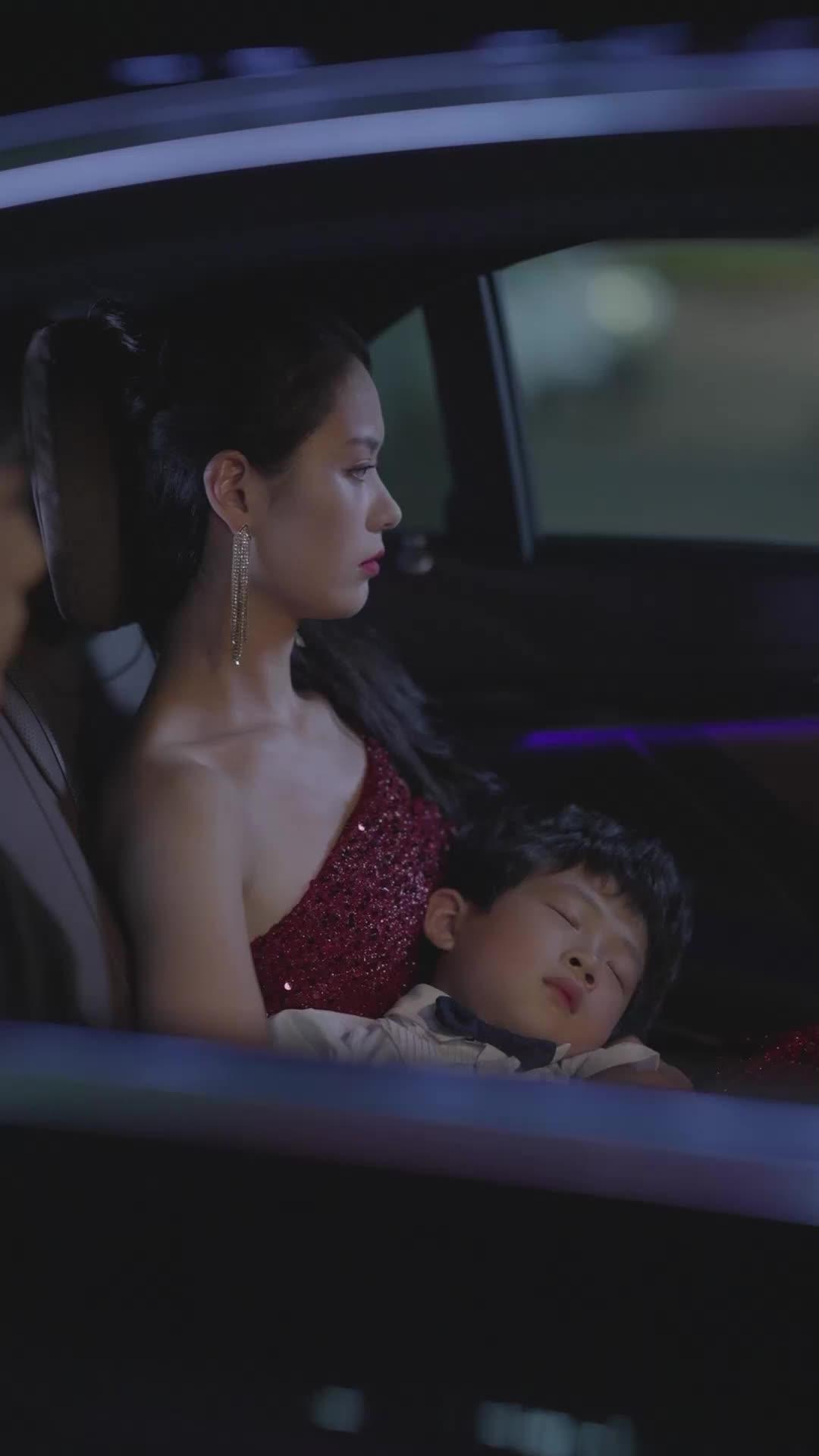 There’s something deeply unsettling about a car ride at night when no one speaks—but everyone is thinking. In this tightly framed sequence from *Love, Lies, and a Little One*, the tension isn’t shouted; it’s whispered in the flicker of ambient LED lighting, the subtle shift of a shoulder, the way a hand hovers just above a sleeping child’s forehead before retreating. The woman—let’s call her Lin Mei, though the script never names her outright—wears a dress that catches light like crushed rubies, each sequin a tiny accusation. Her earrings, long and shimmering, sway with every micro-movement, as if even her jewelry is restless. She holds a boy—perhaps six or seven—in her lap, his small body draped across her thigh, his bowtie slightly askew, his breath steady and innocent. He sleeps soundly, unaware that the world around him has fractured into three separate orbits: hers, his father’s (or is he?), and the silent third presence who sits beside them, watching, calculating.