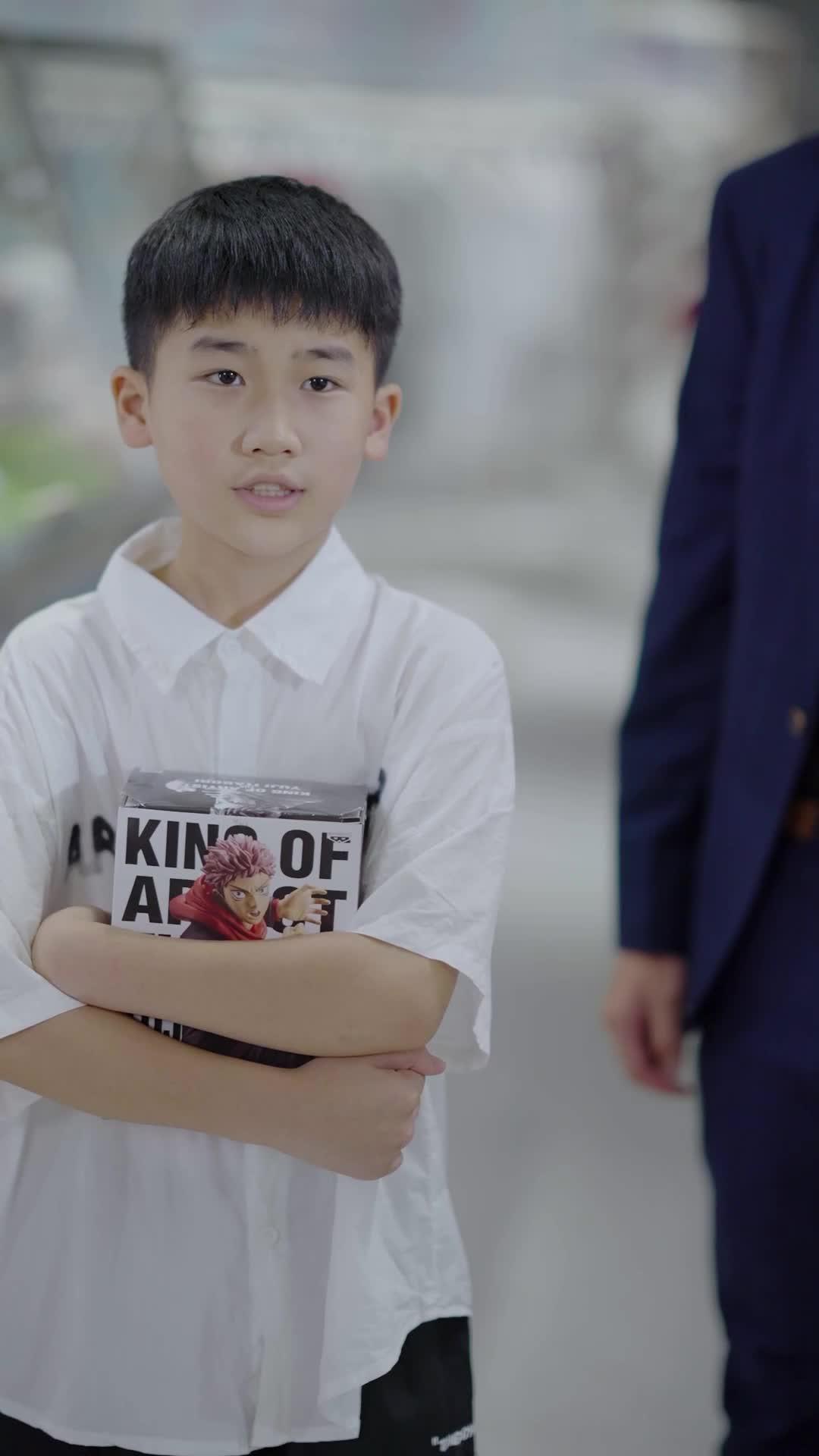 There’s a particular kind of dread that settles in your chest when a child stops talking—not because he can’t, but because he’s been taught *not to*. That’s the atmosphere hanging over the third-floor collector’s lounge in Love, Lies, and a Little One, where every object in the display cases seems to whisper secrets no adult dares name aloud. Xiao Yu stands like a statue carved from hesitation, arms crossed over the KING OF ART box, his posture rigid, his breathing shallow. He’s not hiding. He’s *waiting*. Waiting for someone to say the wrong thing. Waiting for the moment the carefully balanced facade cracks. And oh, does it crack—slowly, deliberately, like a fault line giving way beneath polite conversation. The man in the navy blazer—Lin Jie—is the first to test the ground. He leans in, grinning, all charm and false warmth, then covers Xiao Yu’s mouth with his palm. Not roughly. Almost tenderly. As if silencing a petulant child at a dinner party. But Xiao Yu’s eyes don’t narrow in anger. They widen in resignation. He’s done this before. He knows the script. Cover the mouth. Nod. Look down. Don’t let them see you think.