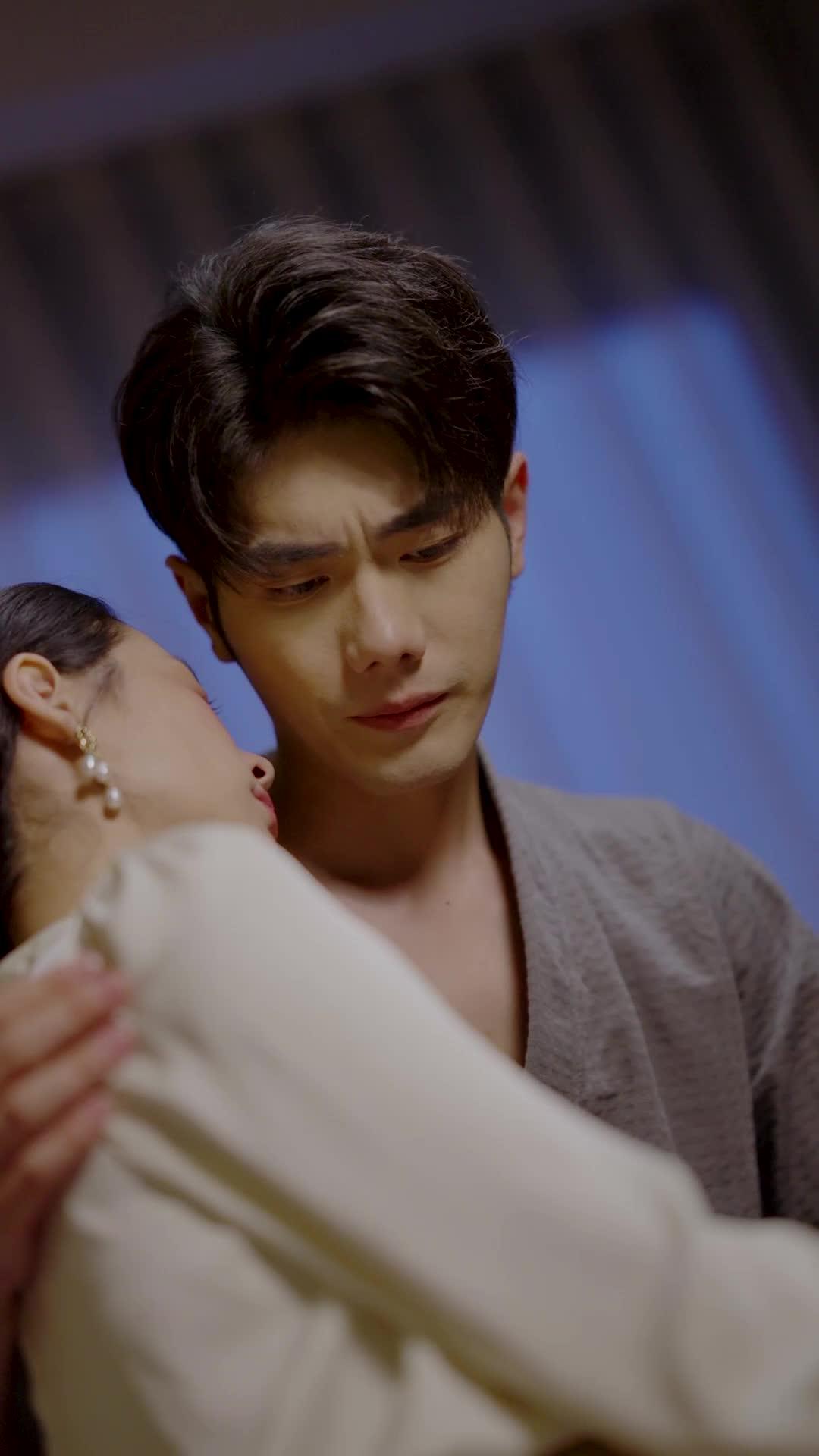 Let’s talk about the bed. Not as furniture, but as stage, confessional, crime scene. In *Love, Lies, and a Little One*, the bed isn’t passive—it’s complicit. From the first embrace between Lin Wei and Chen Xiao, the mattress absorbs their tension like a sponge. He grips her shoulders, yes, but his thumbs press just below her jawline—not possessive, not gentle, but *testing*. As if checking for pulse, for resistance, for truth. Chen Xiao’s ear, adorned with those delicate pearl-and-gold earrings, becomes a focal point: every shift of her head, every intake of breath, is framed around that earring catching light. It’s a visual motif—beauty under surveillance. She lies back, not yielding, but *positioning*. Her hands rest lightly on his forearms, fingers splayed—not clinging, but measuring pressure. When he leans down, she doesn’t close her eyes. She watches him descend, lips parting not in anticipation, but in assessment. That’s the first crack in the facade: real desire closes the eyes. Suspicion keeps them open. And Lin Wei? He kisses her—not deeply, but precisely, as if stamping a seal on a document. His hand slides to the back of her neck, fingers threading through her hair, and for a second, the camera lingers on the way her scalp flexes beneath his grip. Is it affection? Or is it restraint? The editing gives us no answer. It just shows us the texture of the gray robe against her cream blouse, the way the sheet wrinkles under her hip as she shifts—not away, but *into* him, as if bracing for impact.