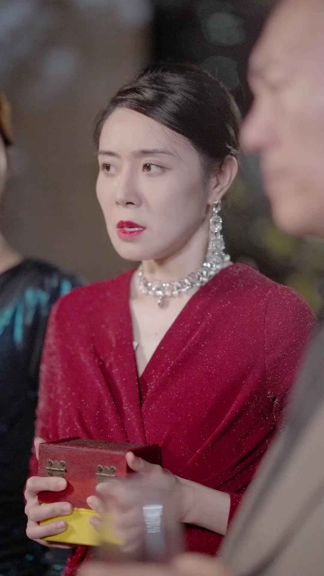 Then comes Yao Jing. Oh, Yao Jing. She doesn’t wear red. She wears *teal*—a color that reflects light unpredictably, shifting from deep ocean to electric pulse depending on the angle. Her dress hugs her frame like armor, and her jewelry—black onyx and silver, echoing the severity of her expression—suggests she’s not here to celebrate, but to witness. She crosses her arms not out of defensiveness, but out of practiced detachment. When Lin Mei stammers, Yao Jing’s lips twitch—not in mockery, but in recognition. She knows the script. She may have even helped write it. Her presence is the counterpoint to Lin Mei’s volatility: where Lin Mei reacts, Yao Jing observes. Where Lin Mei pleads, Yao Jing calculates. And when the box falls? Yao Jing doesn’t flinch. She simply turns her head, just enough to catch Zhou Yi’s entrance, and for the first time, her eyes widen—not with surprise, but with dawning realization. The game has changed. And she’s not sure she likes the new rules.