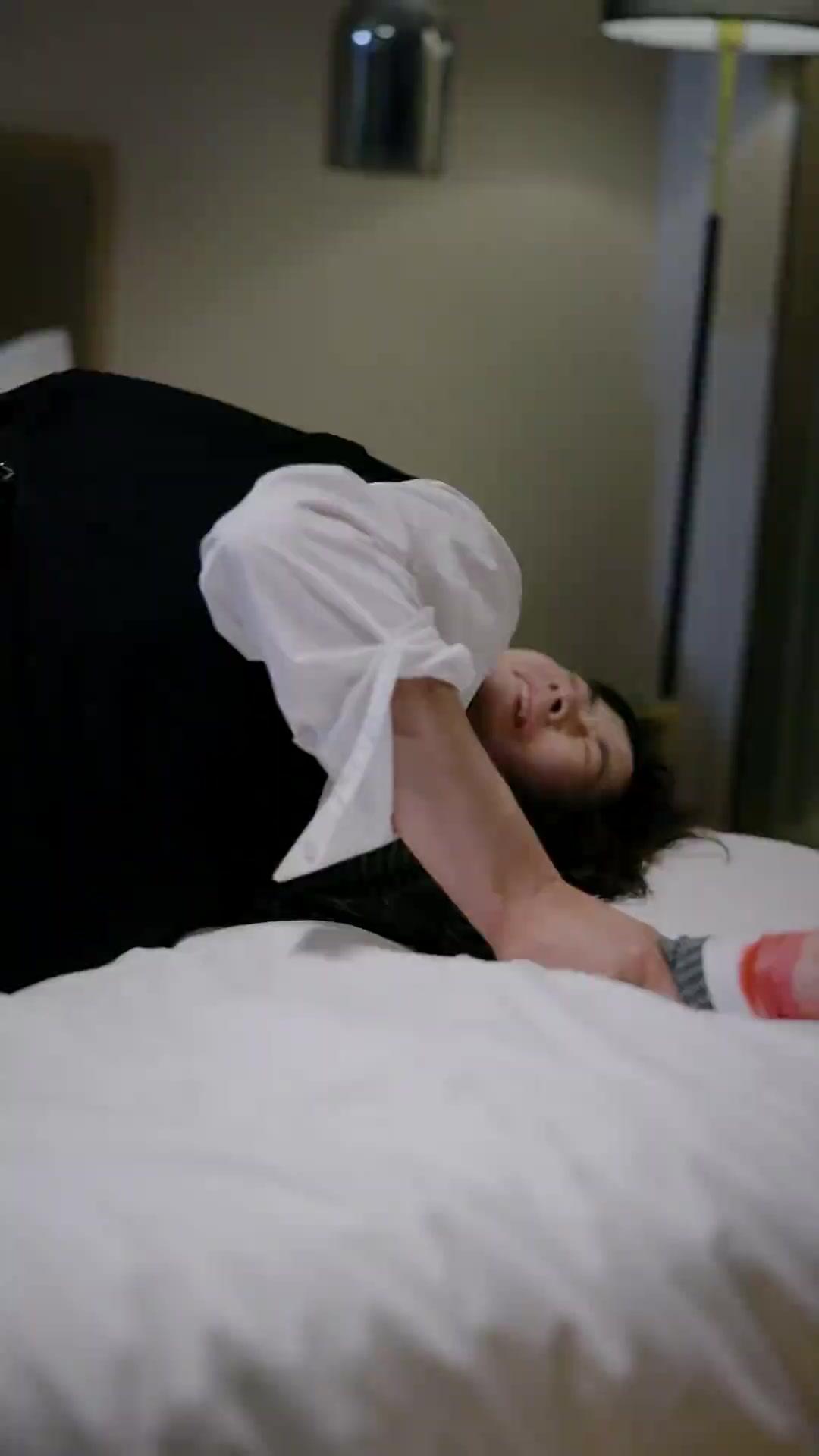 In a dimly lit hotel room where the air hums with unresolved tension, two figures orbit each other like celestial bodies caught in a gravitational collapse—Jinwoo and Yuna, the central duo of the short-form drama *Lovers or Siblings*. From the very first frame, we’re thrust into intimacy turned volatile: Jinwoo, shirt half-unbuttoned, vest askew, leans over Yuna as she lies on the bed, her expression a cocktail of exhaustion, fear, and something far more complicated—recognition. Her wrist, wrapped in a blood-stained bandage, is not just a prop; it’s a narrative anchor, a silent scream that echoes louder than any dialogue could. The camera lingers on that wound—not to sensationalize, but to interrogate. Why is it there? Was it self-inflicted? An accident? Or did someone else place that gauze there, only to let the red seep through like a confession no one dared speak aloud?