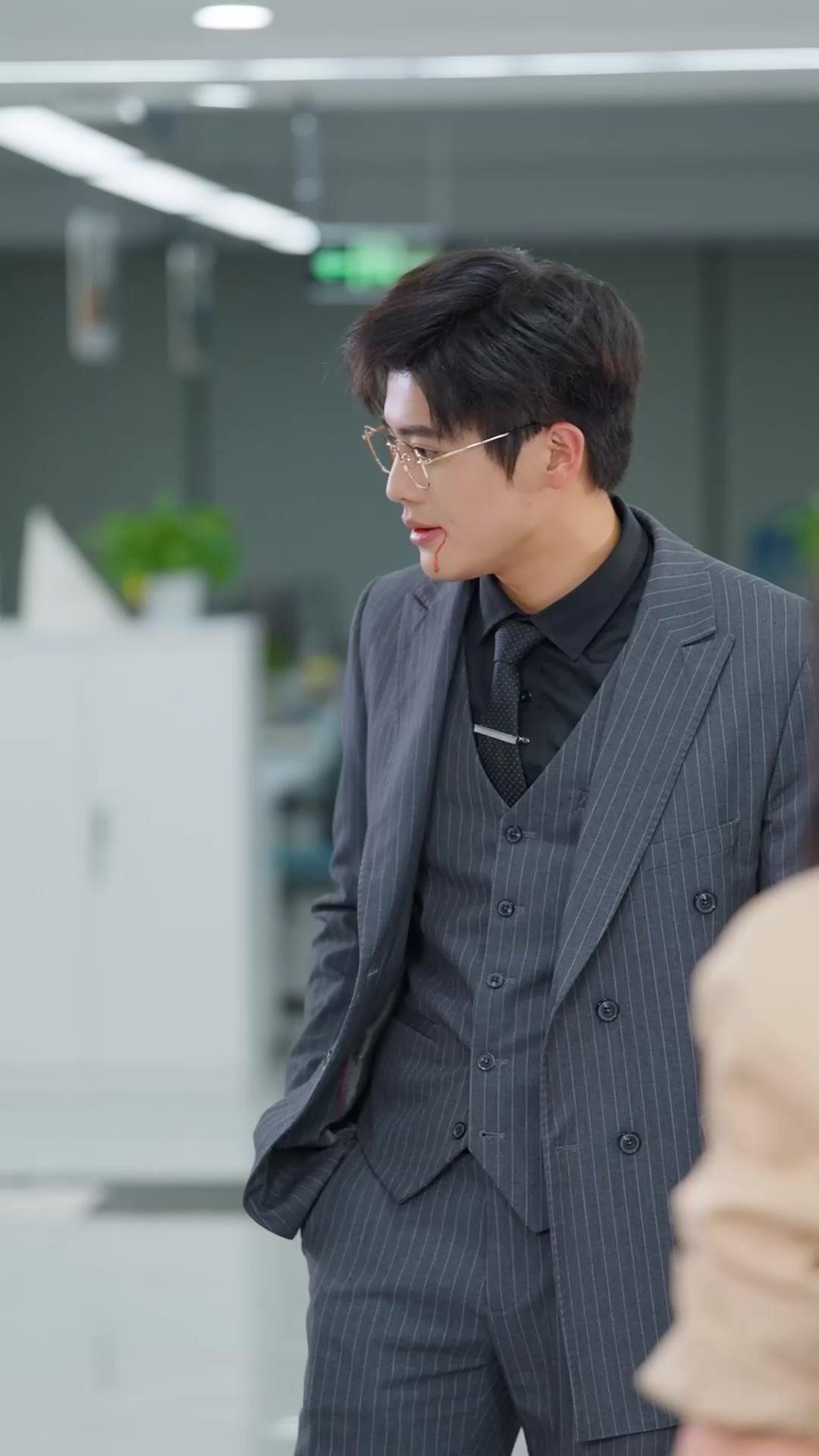 In the sleek, fluorescent-lit corridors of a modern corporate tower—where glass partitions reflect ambition and silence carries weight—the tension in *Married to My Ex-Husband's Boss* isn’t just implied; it’s *visceral*. What begins as a seemingly routine office confrontation between Lin Zeyu, the sharp-eyed, pinstriped strategist with gold-rimmed glasses and a tie clip that gleams like a weapon, and Shen Yiran, the poised but simmering woman in beige cropped blazer and pearl necklace, quickly escalates into something far more layered than workplace drama. There’s blood—not metaphorical, not symbolic in the abstract sense—but real, crimson droplets tracing a path from Lin Zeyu’s lower lip down his chin, catching the overhead lights like tiny warning flares. He doesn’t wipe it. He *holds* it. His posture remains relaxed, hands tucked into his pockets, yet his eyes flicker with something unreadable: defiance? Regret? Or simply the exhaustion of being perpetually misunderstood?