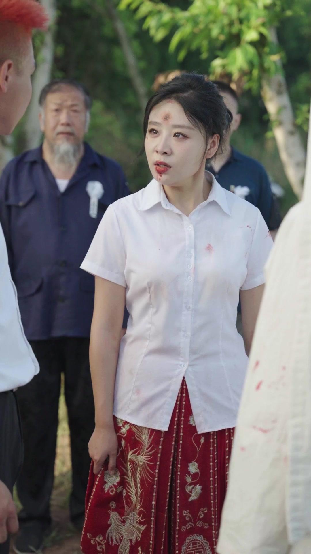 Xiao Man’s transformation is quieter, but no less devastating. At first, she seems passive—a doll in bloodstained silk, her forehead marked with a wound that could be self-inflicted or symbolic. But watch her hands. When the group swarms Li Wei, dragging him down into the dirt, she doesn’t join the pile. She circles. She waits. Then, as he lies gasping, she kneels—not beside him, but *in front*, forcing eye contact. Her lips move. No subtitles. No dialogue needed. The tilt of her chin says everything: *You did this. You chose this. Now live with it.* Her red skirt, embroidered with phoenixes and double happiness symbols, becomes ironic armor. In traditional Chinese symbolism, the phoenix rises from ashes. Here, Xiao Man doesn’t rise—she *stands*, rooted, while others collapse around her. She is neither bride nor mourner. She is the witness who refuses to look away. And when the elder woman finally lowers the phone, her expression shifts—not to triumph, but to exhaustion. She knows the recording won’t save them. It will only haunt them longer.
