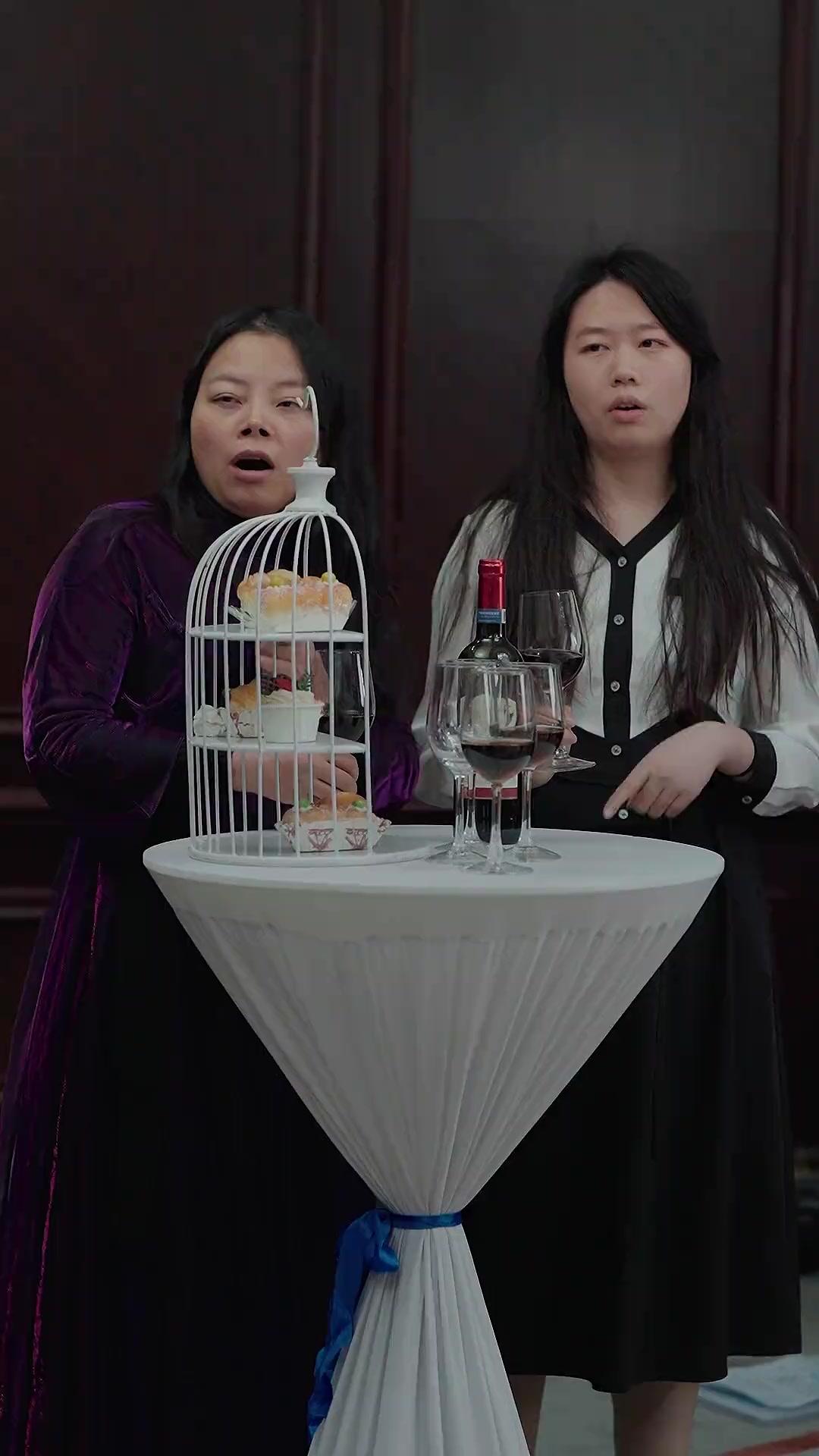 The opening shot of *My Journey to Immortality* is deceptively elegant—a white birdcage stand draped in satin, holding delicate pastries and flanked by two women whose expressions flicker between curiosity and alarm. One wears a deep purple velvet gown, her mouth agape as if she’s just heard a secret too dangerous to keep; the other, in a black-and-white blouse with a sharp collar, points emphatically—not at the table, but beyond it, toward something unseen yet clearly disruptive. This isn’t just a party setup; it’s a detonator waiting for the right hand to press the trigger. And then she walks in: Lin Xiao, the woman in the black sequined gown, shoulders bare except for cascading strands of beaded chains that shimmer like liquid obsidian. Her hair is pulled back in a tight, disciplined bun, but a few rebellious strands cling to her temples—tiny betrayals of the storm brewing beneath her composure. She doesn’t smile. She doesn’t frown. She simply *arrives*, and the room tilts on its axis.