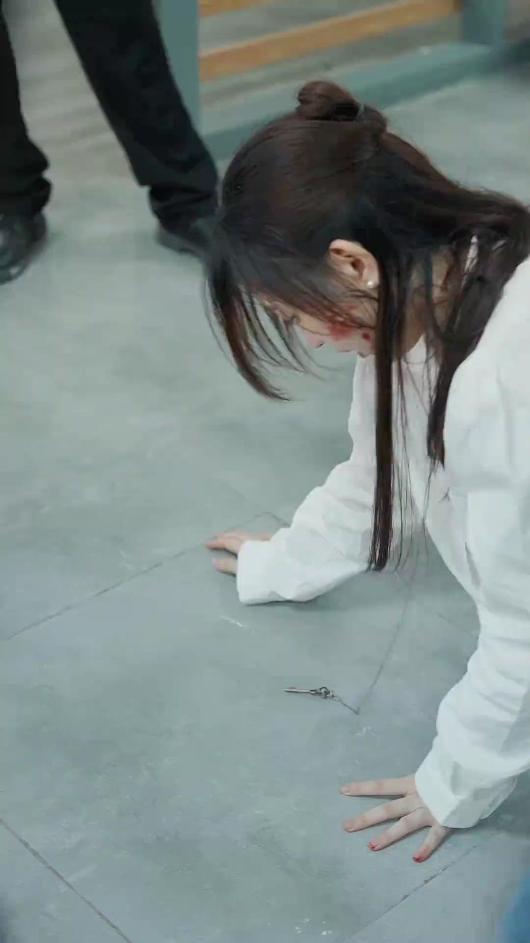 In a sleek, minimalist corporate corridor—glass partitions, muted gray tiles, and soft overhead lighting—the air thickens with unspoken tension. A young woman, her white blouse stained with blood near her temple and cheek, sits hunched against a wall, knees drawn up, hands trembling as she clutches a crumpled tissue. Her hair, half-tied in a messy bun, falls across her face like a veil of shame or exhaustion. She doesn’t cry loudly; instead, her breath hitches in short, broken gasps, eyes darting sideways—not toward help, but toward judgment. This is not an accident. This is performance. Or perhaps, it’s the aftermath of one.