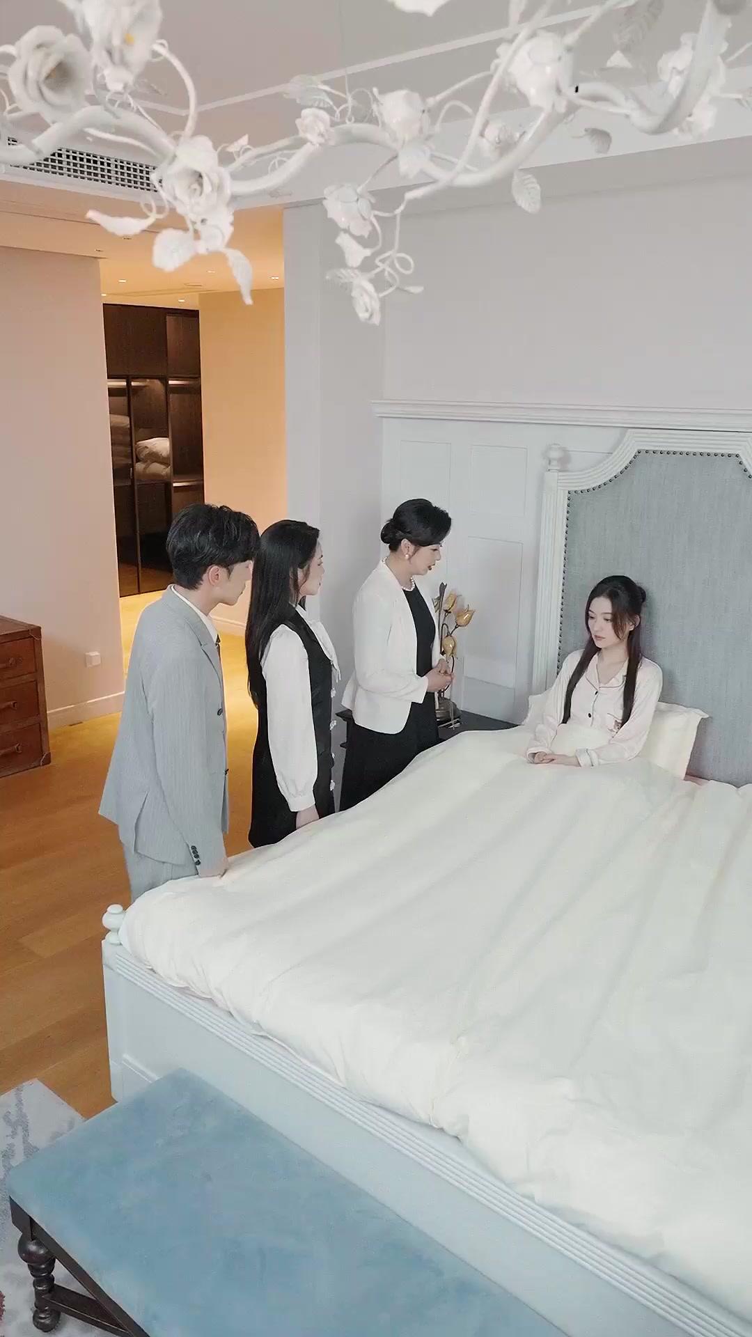 Let’s unpack the staging, because every detail here is deliberate. The bedroom is pristine — white bedding, pale walls, a chandelier made of ceramic roses that look delicate but are probably cast in iron. It’s a space designed to soothe, to reassure. And yet, the air is suffocating. Why? Because the people in it are performing roles they’ve worn for years. Chen Wei, in his double-breasted gray suit, stands slightly angled toward Li Xinyue, his posture protective — but his eyes keep flicking to Madame Lin, checking her reactions like a diplomat monitoring a ceasefire. He’s not here to support Li Xinyue. He’s here to ensure the peace holds. His smile, when it flashes briefly at 00:44, isn’t warmth. It’s damage control. A reflexive attempt to soften the blow before it lands. He knows what’s coming. He’s just hoping it won’t shatter her completely.