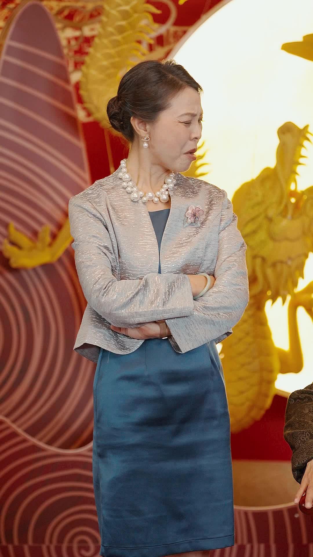 In the opulent, crimson-draped hall adorned with golden dragon motifs and glowing lanterns, a storm of unspoken history crackles in the air—not with thunder, but with the subtle shift of a pearl necklace, the tightening of a double-breasted lapel, and the trembling lip of a woman in white. This isn’t just a wedding rehearsal or a family gathering; it’s a psychological theater where every gesture is a line, every glance a soliloquy. At the center stands Li Meiling, the matriarch whose silver brocade jacket gleams like armor under the warm light, her pearls arranged in three perfect strands—each one a symbol of decades of composure now fraying at the edges. Her posture shifts from poised authority to visceral disbelief within seconds, arms crossing, then dropping, then pointing with a finger that trembles not from weakness, but from the weight of revelation. She doesn’t shout; she *accuses* with silence, with a raised eyebrow, with the way her mouth forms words only the camera—and perhaps the man in the black suit—can truly hear. That man, Zhao Yichen, stands like a statue carved from restraint: charcoal-gray checkered suit, rust-brown tie with faint geometric patterns, a silver lapel pin shaped like a phoenix feather—subtle, deliberate, defiant. His eyes never waver, even when Li Meiling’s voice rises (though we hear no sound, the tension is auditory in its intensity). He listens, he absorbs, he *waits*. And when he finally moves—his hand snapping forward, index finger aimed like a pistol at an unseen target—it’s not aggression; it’s declaration. A claim of truth, of ownership, of reclamation. Behind him, another man lingers—Chen Wei, perhaps—the quiet observer in a lighter gray suit, his expression unreadable but his presence heavy with implication. He knows more than he lets on. He’s the keeper of the off-stage script.