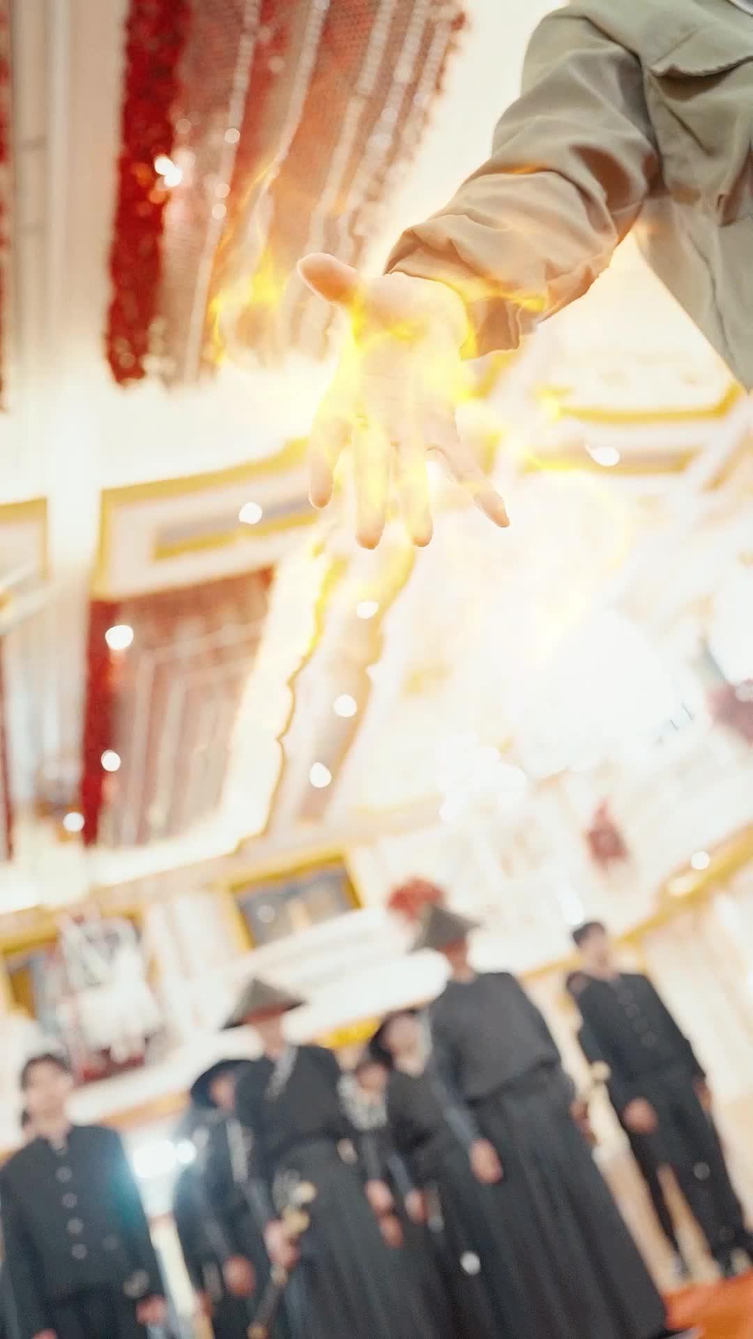 Let’s talk about what happened in that opulent ballroom—not a wedding, not a gala, but a full-blown cinematic detonation disguised as a ceremony. The moment opens with a hand glowing like molten gold, fingers splayed mid-air, light flaring upward as if summoning something ancient and dangerous. It’s not CGI for spectacle’s sake; it’s a visual metaphor—power erupting from within, unbidden, unstoppable. And then we see him: Lin Feng, the man in the olive jacket, white tank top, black trousers—casual, almost defiantly so, in a space where everyone else is draped in silk, lace, or ceremonial armor. He doesn’t walk down the aisle; he *steps* into it, shoulders squared, jaw tight, eyes scanning the room like a man who’s just realized he’s walked into the wrong dimension. His expression isn’t fear—it’s recognition. Recognition of betrayal, of history rewritten, of a love he thought buried now standing before him in a gown stitched with crystals and sorrow.