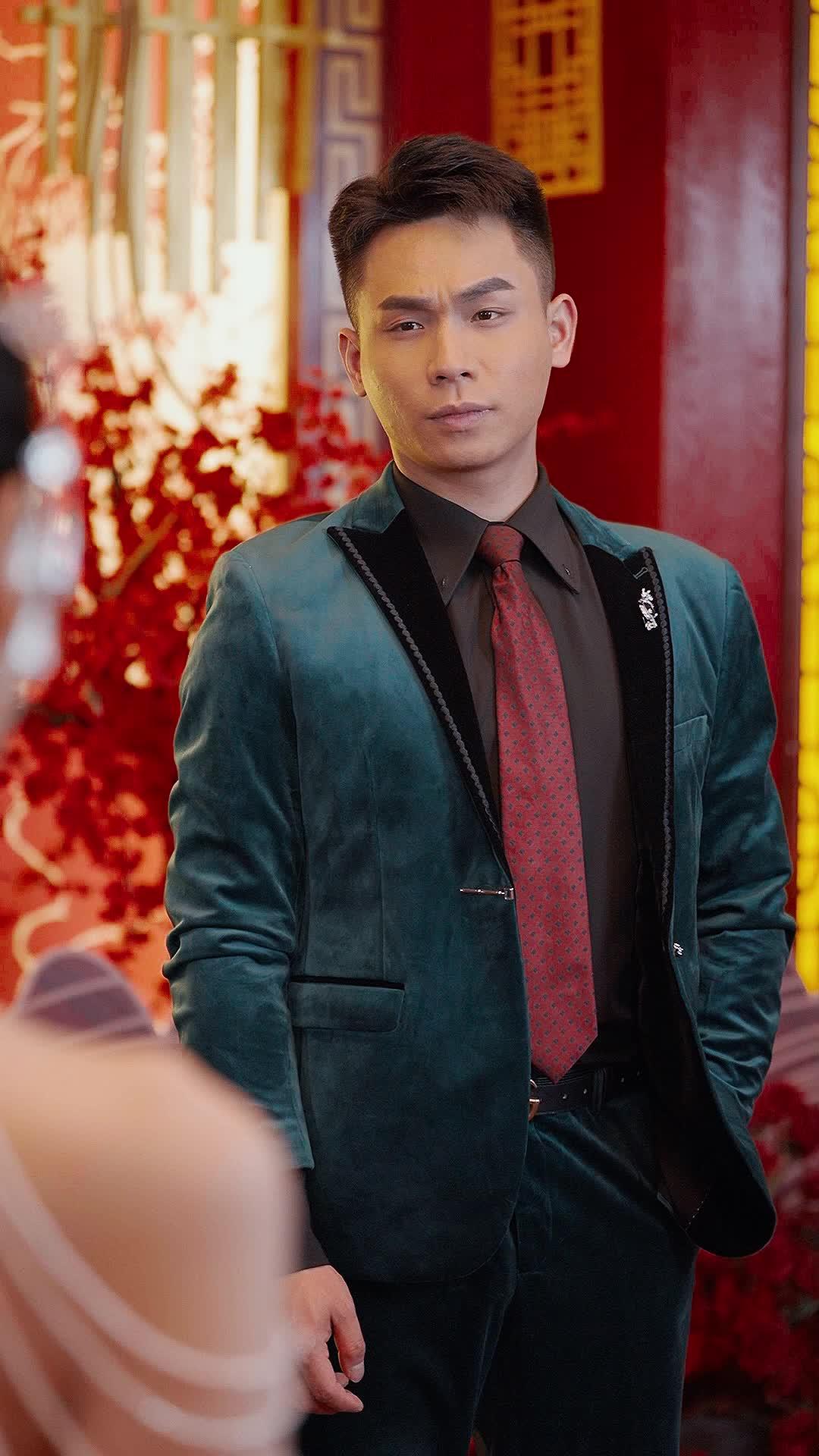 The scene opens like a fever dream—crimson silk, golden dragons coiled in mid-air, and a red carpet that seems to pulse with ancestral weight. This is not just a wedding; it’s a ritual staged on the fault line between tradition and betrayal. At its center stands Lin Zeyu, clad in that impossible teal velvet suit—luxurious, defiant, almost *too* deliberate in its contrast against the blood-red backdrop. His posture is relaxed, one hand tucked into his pocket, the other gesturing with theatrical precision, as if he’s not interrupting a ceremony but conducting a symphony of scandal. Every flick of his wrist carries the weight of years unspoken, every smirk a quiet detonation waiting for its fuse. He isn’t shouting—he’s *narrating*, and the room holds its breath because everyone knows: this isn’t about etiquette. It’s about erasure.
