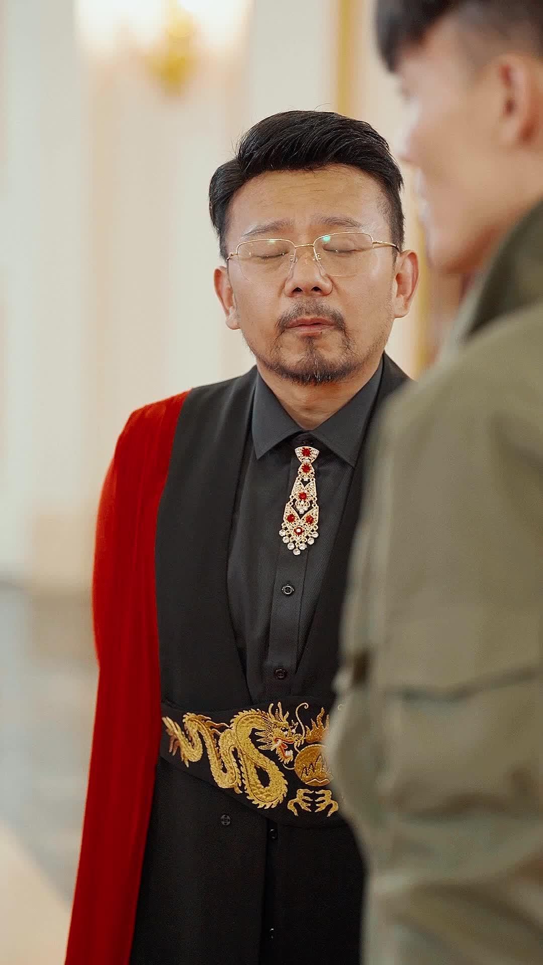 Master Chen is the architect of this tension. His costume alone is a manifesto: black silk shirt, tailored to perfection, but split down the shoulder by a slash of crimson velvet—half mourning, half declaration. The golden dragon belt isn’t mere ornamentation; it’s armor woven into fabric, a symbol of lineage he believes Li Wei forfeited the moment he vanished ten years ago. His glasses are thin-rimmed, scholarly, but his eyes behind them are sharp, calculating. He smiles often—too often—each grin a layer of polish over something brittle underneath. When he addresses Li Wei, his tone is warm, almost paternal: ‘You’ve grown taller. Stronger.’ But his gaze lingers on the scar above Li Wei’s lip, the one he didn’t cause, but which he’s clearly cataloged like evidence. He’s not welcoming a prodigal son. He’s assessing a variable in a system he thought he’d locked down. And then Xiao Yu enters. Not from the side door, not escorted, but walking straight down the aisle as if she owns the gravity of the room. Her dress is breathtaking—not bridal in the Western sense, but regal, almost sacred. The sequins on her bodice don’t just shimmer; they pulse, reacting to the ambient light like bioluminescence. Her necklace, heavy with diamonds, doesn’t dangle—it hangs with intention, each facet reflecting a different angle of the truth no one wants to speak aloud.