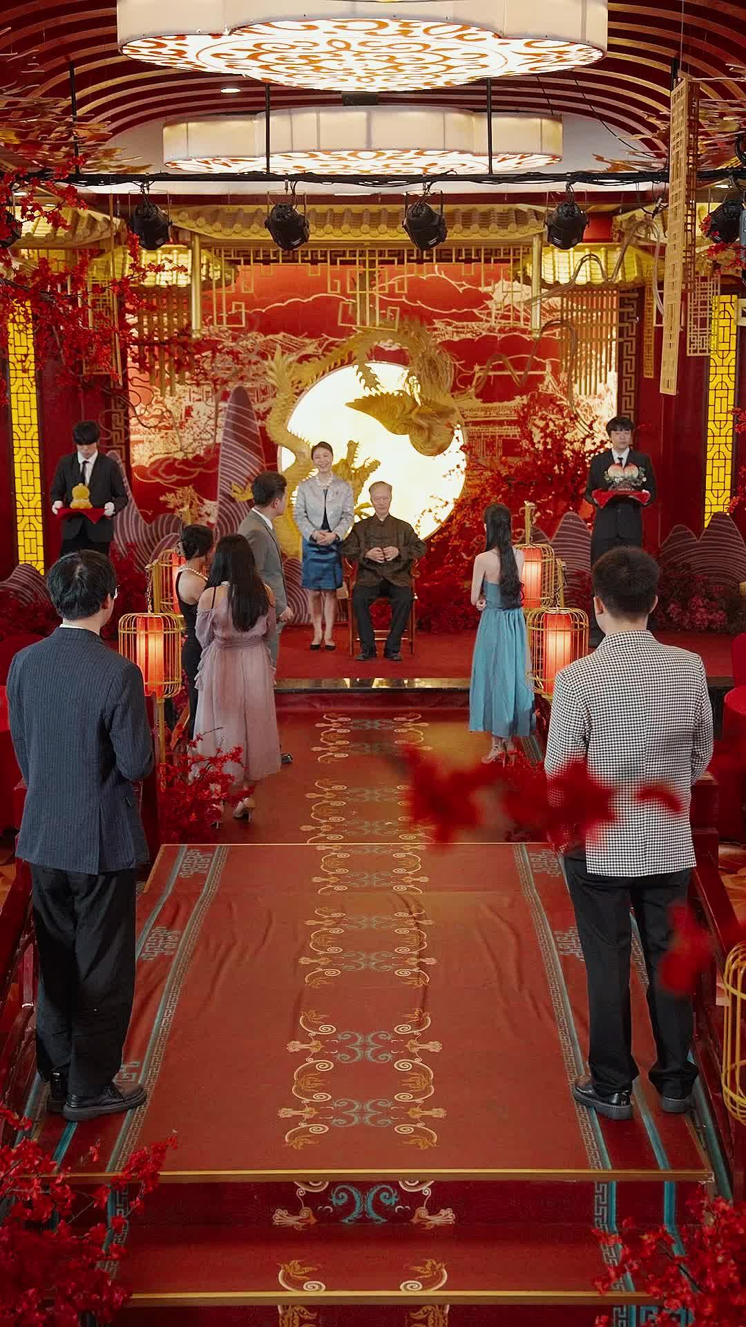 The ceiling fixture—a massive circular lantern painted with swirling phoenix motifs—casts a honeyed glow over the scene, but it does nothing to soften the chill in the air. This is not a wedding. Not yet. It’s a reckoning dressed in silk and incense. The red carpet, embroidered with cloud-and-dragon motifs, leads not to an altar, but to a throne-like chair where Elder Zhang sits, his presence radiating the kind of quiet authority that makes younger men instinctively lower their voices. His hands, gnarled but steady, hold a string of crimson beads—each one polished by decades of repetition, each one a silent tally of regrets, of decisions made in shadow. He doesn’t look at Li Wei when the young man stammers his first line. He looks *through* him, toward the entrance archway, where the scent of plum blossoms lingers like a ghost. That’s when you realize: Elder Zhang isn’t waiting for Li Wei to speak. He’s waiting for someone else to walk through that door.