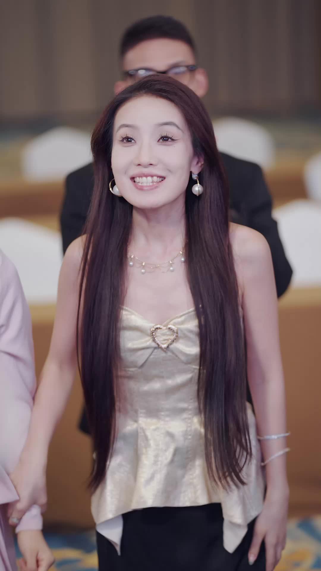 In a grand banquet hall draped in gold-threaded carpets and shimmering chandeliers, where elegance is measured not just in attire but in the precision of every gesture, a quiet storm brews beneath the surface of polished smiles. The scene opens with Lin Xiao, her long chestnut hair cascading like liquid silk over a champagne-gold satin top—its sweetheart neckline adorned with a delicate heart-shaped brooch that glints under the soft overhead lights. She stands beside Chen Yiran, whose pale pink double-breasted blazer cinches at the waist with a bow, exuding controlled sophistication. Their hands are clasped—not out of affection, but necessity. A silent pact. Behind them, men in tailored suits watch, some amused, others calculating. This isn’t just a gathering; it’s a stage, and everyone knows their lines—even if they’re improvising.