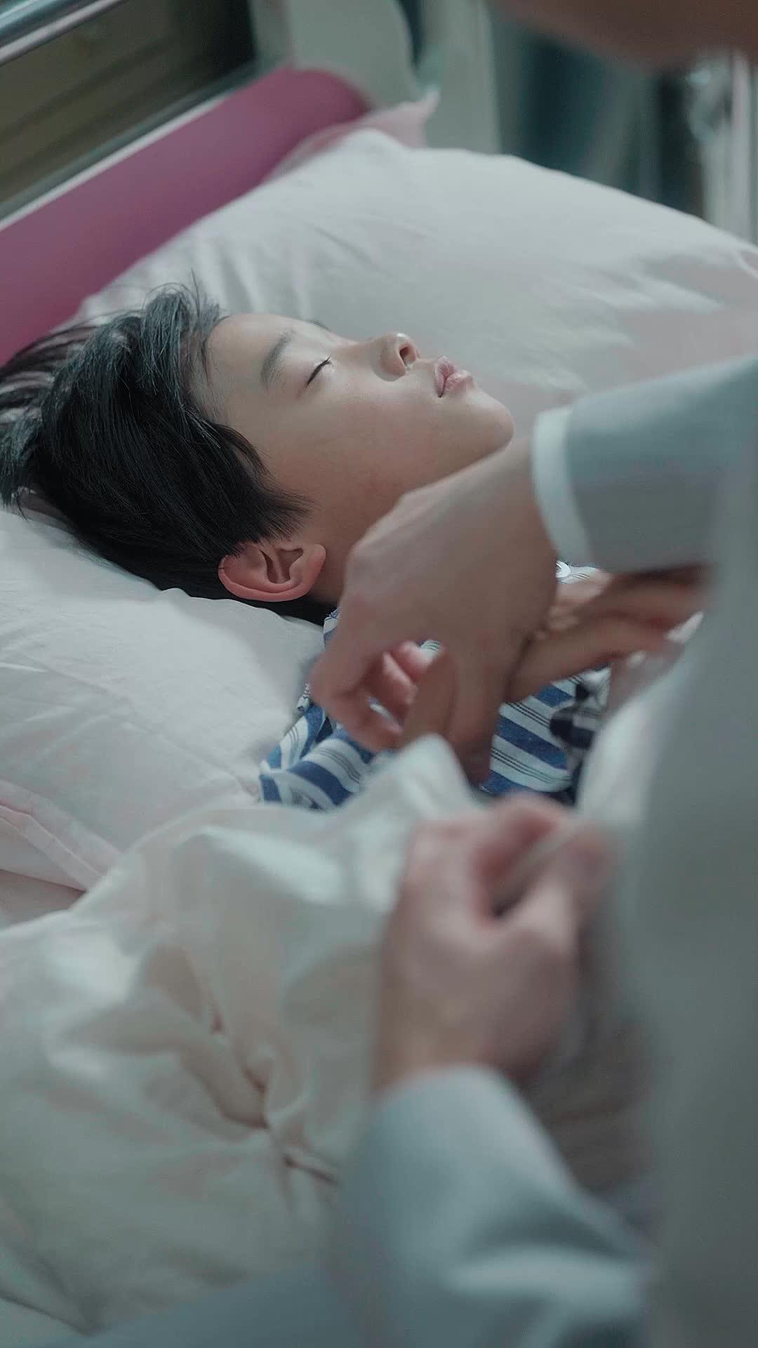 The boy—let’s call him Kai, though the film never names him outright—lies still, chest rising and falling like a tide too weak to reach shore. His striped pajamas are rumpled, his hair damp at the temples. He’s not unconscious; he’s conserving energy, retreating inward, the way children do when the world feels too loud, too sharp. Liang Wei sits beside him, sleeves rolled to the forearm, tie loosened just enough to suggest he’s been here longer than protocol allows. He’s not scrolling his phone. He’s not checking emails. He’s watching Kai’s eyelids flutter, counting seconds between breaths, memorizing the exact angle of his jaw when he sleeps. This isn’t performance. This is pilgrimage. And when Xiao Man finally steps inside, he doesn’t look up immediately. He waits. Lets her settle into the silence. Lets her feel the weight of what she’s interrupted.