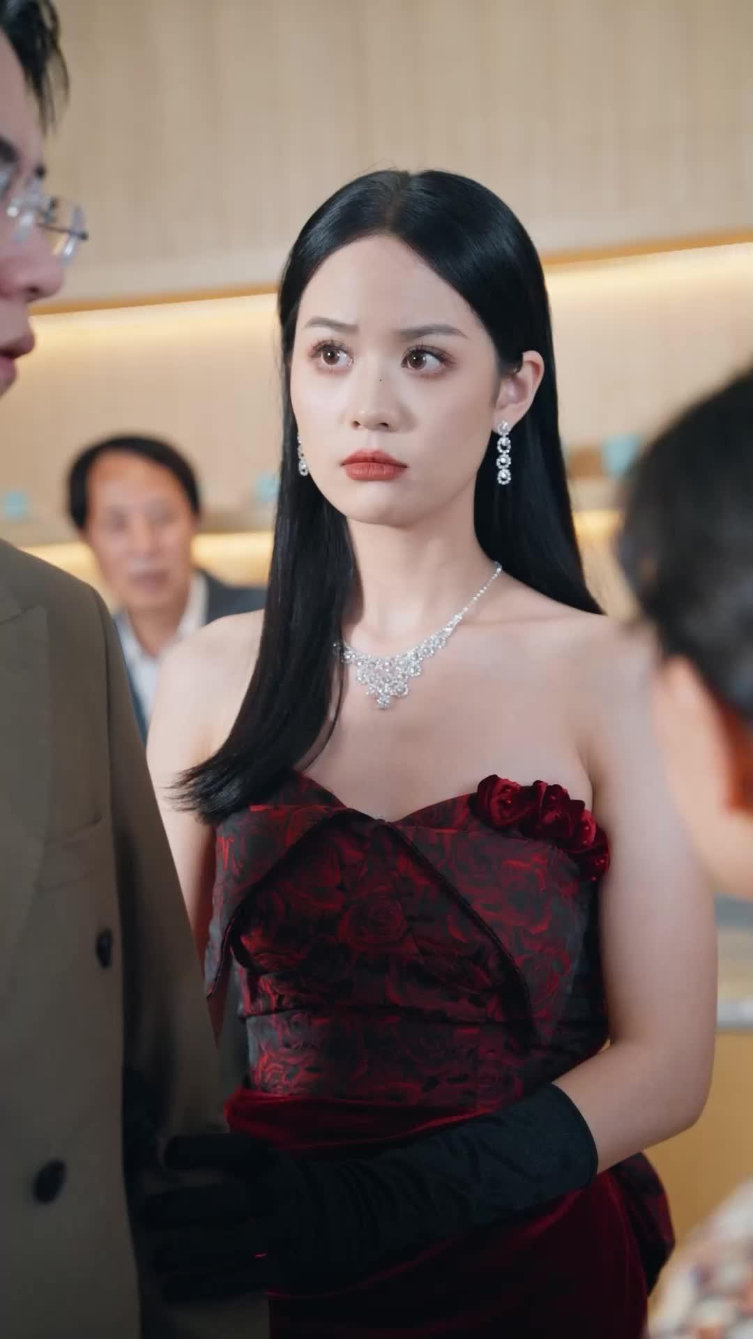 In a world where elegance is armor and silence speaks louder than shouting, *Phoenix In The Cage* delivers a masterclass in restrained tension—no explosions, no car chases, just a single red gown, a pair of black gloves, and the unbearable weight of unspoken truths. The central figure, Lin Xue, stands like a statue carved from velvet and defiance, her strapless crimson dress adorned with rose motifs that seem to bloom under the soft ambient lighting of what appears to be an upscale private lounge or boutique event space. Her jewelry—a diamond necklace cascading like frozen tears, matching drop earrings that catch every flicker of light—is not mere decoration; it’s a declaration. She wears power like second skin, yet her eyes betray something else: exhaustion, perhaps, or the quiet fury of someone who has been misjudged one too many times.