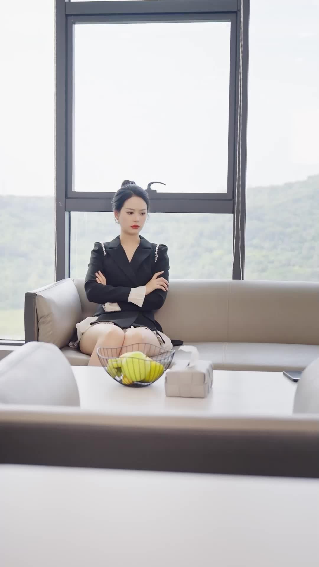 In the opening frames of *Phoenix In The Cage*, we are thrust into a high-rise office bathed in soft daylight—clean lines, minimalist furniture, and a panoramic view of green hills that feel almost mocking in their serenity. Seated on a beige leather sofa is Lin Xiao, her posture rigid, arms crossed like armor over a black blazer adorned with delicate crystal chains on the shoulders—a subtle but deliberate signal of elegance under pressure. Her hair is pulled into a tight bun, red lipstick sharp as a blade, eyes fixed not on the window but on the space just beyond it, where tension is already gathering. Enter Chen Wei, his entrance not marked by sound but by movement: a slow pivot, hands tucked into his olive double-breasted suit, glasses catching the light like surveillance lenses. He doesn’t sit immediately. He stands. He points. Not at her face, but *above* her head—toward the ceiling, or perhaps toward some invisible hierarchy only he can see. That gesture alone tells us everything: this isn’t about facts. It’s about authority, about who gets to define reality in this room.