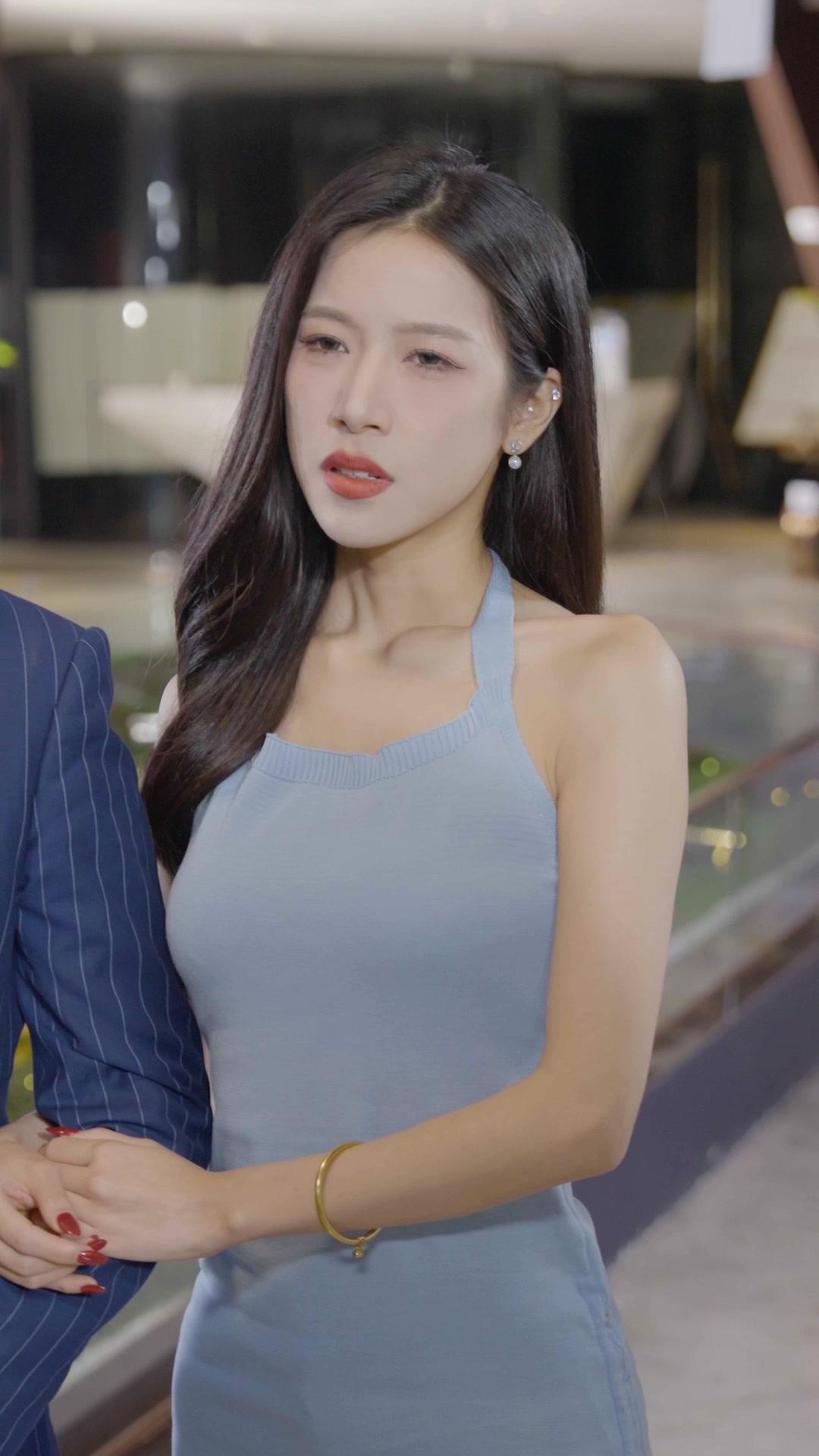 In the opening frames of this tightly wound sequence from *Pretty Little Liar*, we’re dropped straight into a high-stakes social corridor—polished marble floors, ambient lighting that flatters but never forgives, and a group of people whose postures betray more than their words ever could. The woman in the pale blue halter dress—let’s call her Lin—stands with her arms loosely clasped, fingers painted crimson like a warning signal no one seems to heed. Her expression shifts subtly across just six seconds: from polite neutrality to startled disbelief, then to something sharper—almost accusatory—as if she’s just heard a phrase she thought was buried forever. Her gold bangle catches the light each time she moves, a tiny echo of the tension coiling beneath her skin. Beside her, the man in the navy pinstripe suit—Zhou Wei—holds her wrist lightly, not possessively, but as if anchoring her to reality. His grip is firm, yet his smile remains open, almost theatrical. He knows he’s being watched. And he likes it.