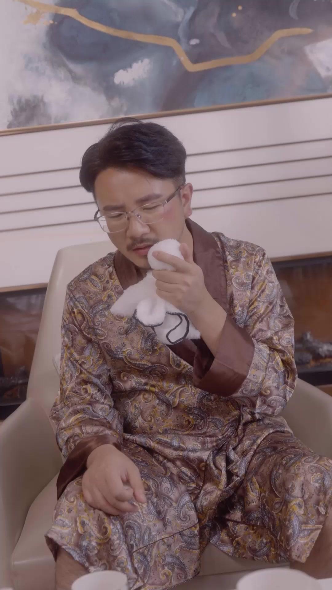 In a lavishly appointed living room—marble floors, geometric rugs, crystal chandeliers suspended like frozen rain—the air hums with unspoken tension. This isn’t just a domestic scene; it’s a stage set for emotional detonation. At its center sits Lin Wei, draped in a silk robe of gold-and-brown paisley, his glasses slightly askew, a white towel clutched like a shield. His face bears the faint flush of recent distress—or perhaps guilt. He wipes his brow, then his mouth, then his eyes—not with urgency, but with deliberation, as if rehearsing a performance he’s already failed. Behind him, a large abstract painting looms, its swirling blues and golds echoing the chaos beneath the surface. The camera lingers on his hands: one holding the towel, the other twitching near his thigh, fingers curling inward like he’s trying to grasp something that keeps slipping away.