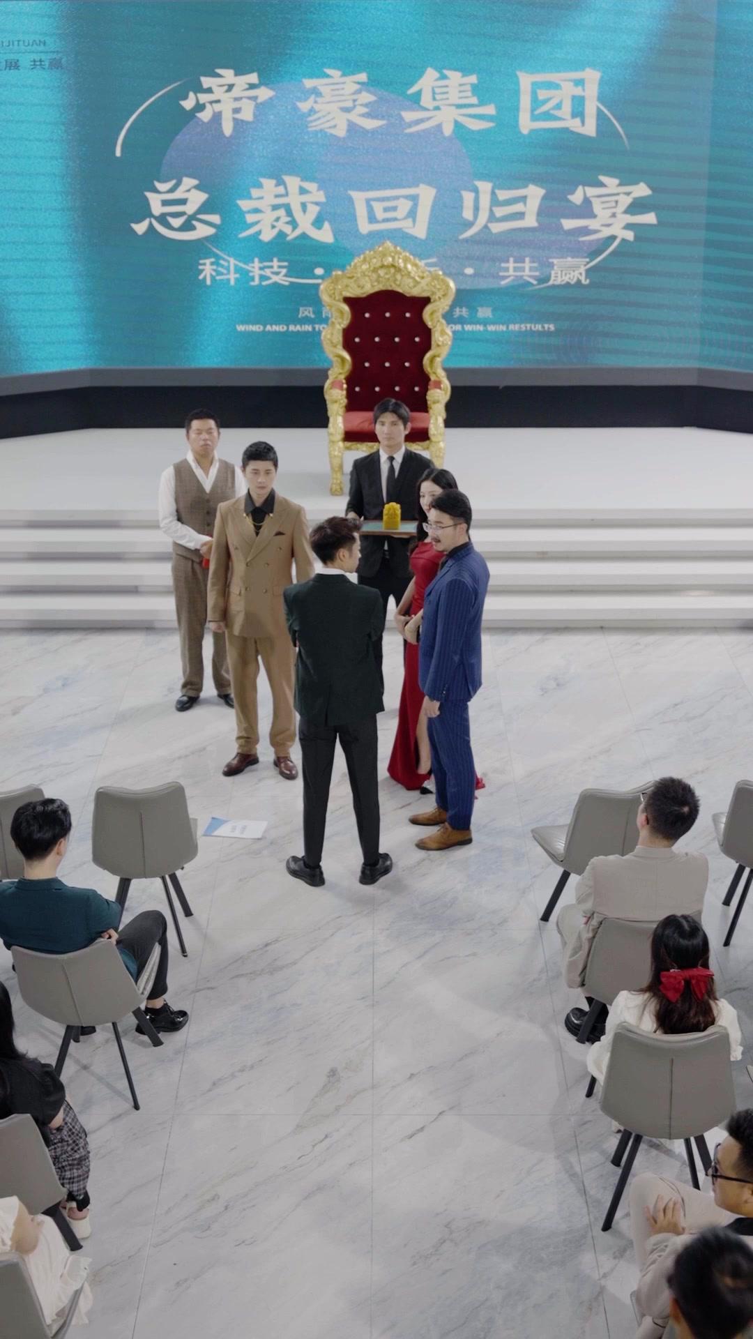 Lin Zeyu, meanwhile, stood like a statue carved from calm. Tan suit, black shirt, gold chain draped like a relic. His hands in pockets, yes—but notice the angle of his thumbs. They weren’t resting. They were *pressing* against his thigh, a subtle grounding gesture used by people who’ve trained themselves not to flinch. He knew what was coming. He’d been preparing for this moment since the day he walked away from Dihao Group. The throne behind him wasn’t decoration. It was a mirror. And every time the camera cut back to him, he wasn’t looking at the crowd. He was looking *through* them, toward the exit door on the far left—where a shadow moved at 0:45. Was it security? A lawyer? Or someone else who knew the real story? The show never confirms. It just lets the doubt fester.