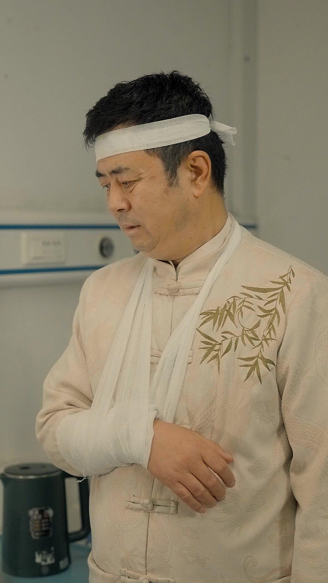 The opening frames of Return of the Lion King: Legacy Reignited don’t begin with fanfare or martial arts choreography—they open with silence, bandages, and a man whose posture screams exhaustion more than pain. Li Wei, the older man in the cream-colored embroidered tunic, stands like a statue carved from regret: head wrapped, arm suspended in a sling, eyes darting not toward the camera but toward something unseen—perhaps memory, perhaps guilt. His clothing, traditional yet subtly worn, suggests a man who once commanded respect through lineage or skill, now reduced to waiting. The hospital room is sterile, fluorescent, impersonal—but the tension inside it is thick enough to choke on. Every breath he takes feels deliberate, as if he’s rehearsing how to speak without breaking. Behind him, a black electric kettle sits idle on a counter, its presence absurdly mundane against the emotional gravity of the scene. It’s not just a prop; it’s a reminder that life continues, even when people freeze.