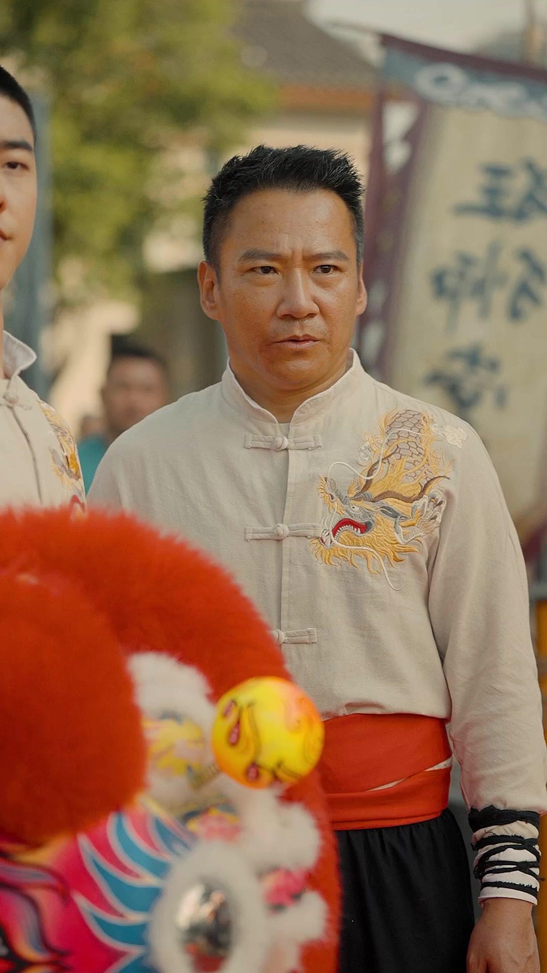 In the vibrant, sun-dappled courtyard of what appears to be a historic cultural plaza—perhaps a restored riverside town with tiled roofs and banners fluttering in the breeze—the air hums not just with drumbeats, but with unspoken tension. Return of the Lion King: Legacy Reignited opens not with fanfare, but with stillness: a man named Lin Wei stands rigid, eyes fixed forward, his cream-colored tunic embroidered with a golden dragon coiled mid-roar, its red tongue flicking like a warning. His posture is disciplined, almost ritualistic—yet his brow is furrowed, his lips pressed thin. He isn’t performing yet. He’s waiting. Beside him, partially out of frame, another performer holds the head of a lion costume—bright orange fur, exaggerated white teeth, yellow orbs for eyes—its mouth gaping open like a silent scream. The contrast is immediate: tradition draped in spectacle, discipline masked by flamboyance.