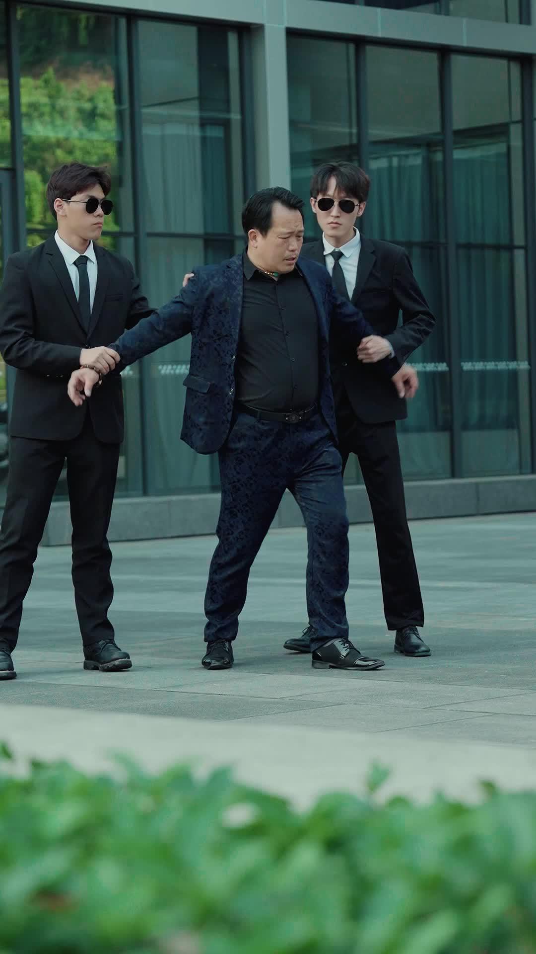In the opening sequence of *Rise from the Dim Light*, we’re thrust into a world where power isn’t shouted—it’s whispered, gestured, and worn like armor. The first shot captures three men walking across a sleek plaza, flanked by glass-and-steel architecture that reflects not just light, but hierarchy. At the center is Lin Zhi, a man whose navy brocade suit gleams with subtle opulence—his turquoise pendant, jade rings, and beaded wristband aren’t accessories; they’re declarations. Flanking him are two younger men in identical black suits and aviator sunglasses—silent, rigid, almost interchangeable. Their posture screams ‘security detail,’ yet their stillness feels more like surveillance than protection. When Lin Zhi suddenly stumbles—arms flailing, face contorted in mock panic—the contrast is jarring. One bodyguard remains impassive; the other shifts slightly, as if debating whether to intervene or let the performance unfold. This isn’t clumsiness. It’s theater. Lin Zhi’s exaggerated stumble, followed by his sharp pivot and finger-pointing toward the horizon, suggests he’s not fleeing danger—he’s redirecting attention. His eyes, wide and alert beneath furrowed brows, betray no fear—only calculation. The green shrubbery in the foreground blurs, framing him like a stage curtain parting. We’re not watching a man being escorted—we’re witnessing a king testing his court’s loyalty through controlled chaos.