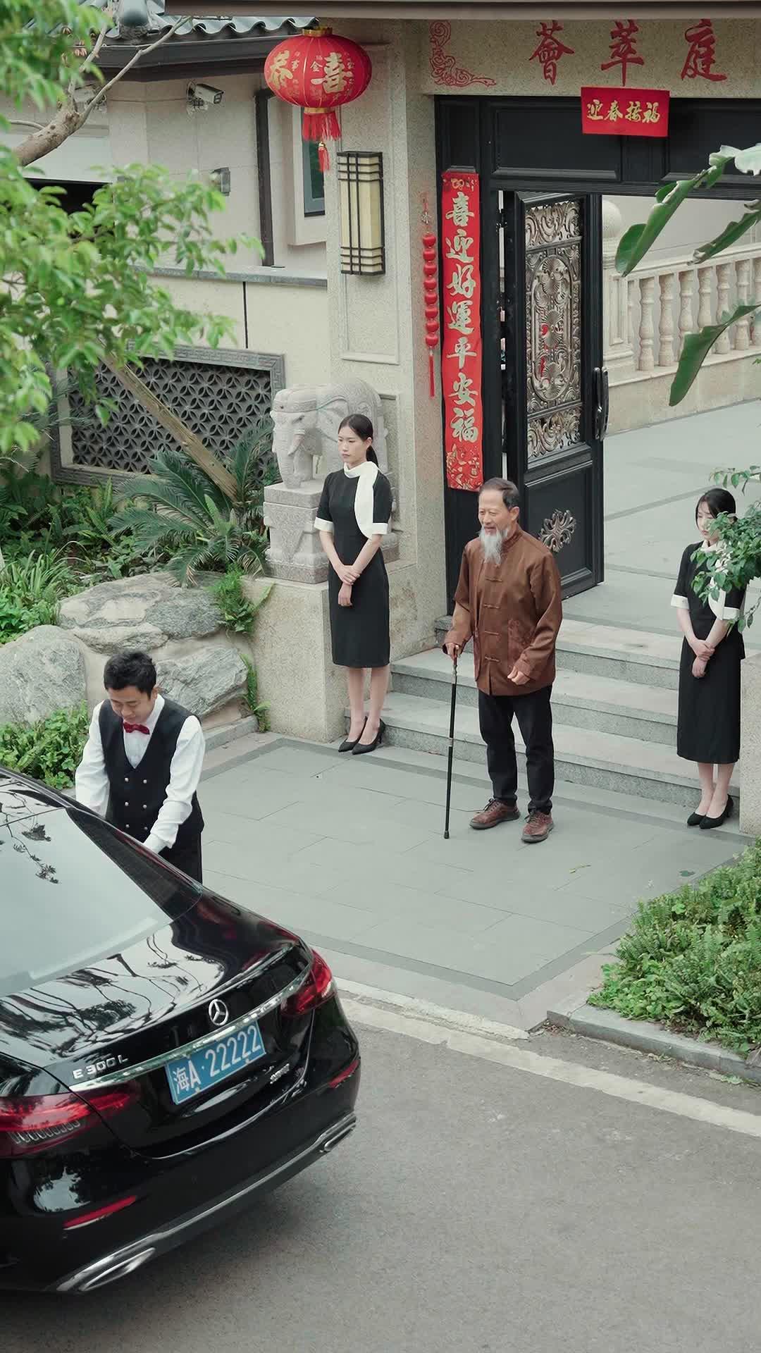 Let’s talk about the red banners. Not the ones hanging on the gate—though those matter—but the ones we don’t see. The ones stitched into the fabric of every interaction in *Rise from the Dim Light*. The opening shot establishes the visual grammar of this world: symmetry, order, reverence. The stone lion flanking the entrance isn’t decorative; it’s a silent judge. The lantern above the door isn’t just festive—it’s a beacon, signaling that this is a place where appearances are curated, where every gesture is calibrated for meaning. And yet, the most powerful moments in this sequence happen in the spaces between the symbols. When Xiao Yu steps out of the Mercedes, she doesn’t look at the banners. She looks at Lin Wei. Her gaze lingers on his face, not his clothes, not his cane, not the grandeur surrounding him. She’s searching for the man beneath the myth. And what she finds makes her exhale—a slow, shaky release of breath that tells us she’s been holding it since the car turned onto the street.